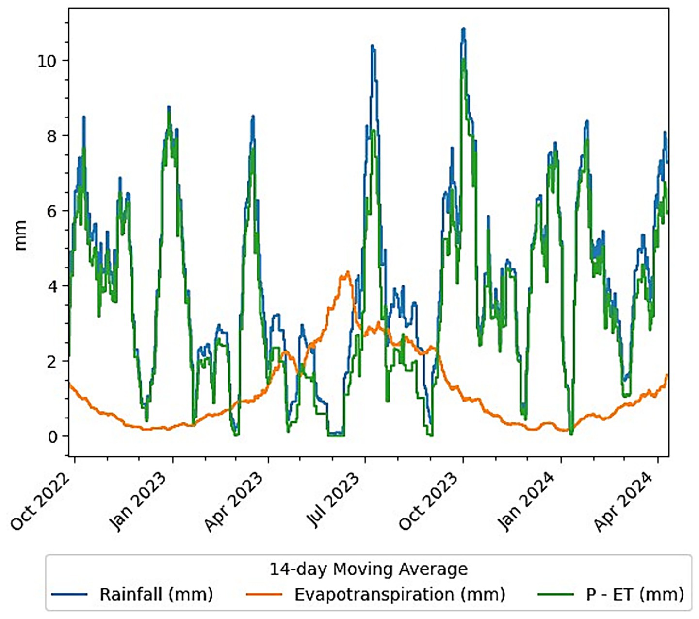 Figure 2. Precipitation and evapotranspiration data from Dumyat during the porewater data series (20th September 2022–18th April 2024), taken from Open-Meteo (2025).