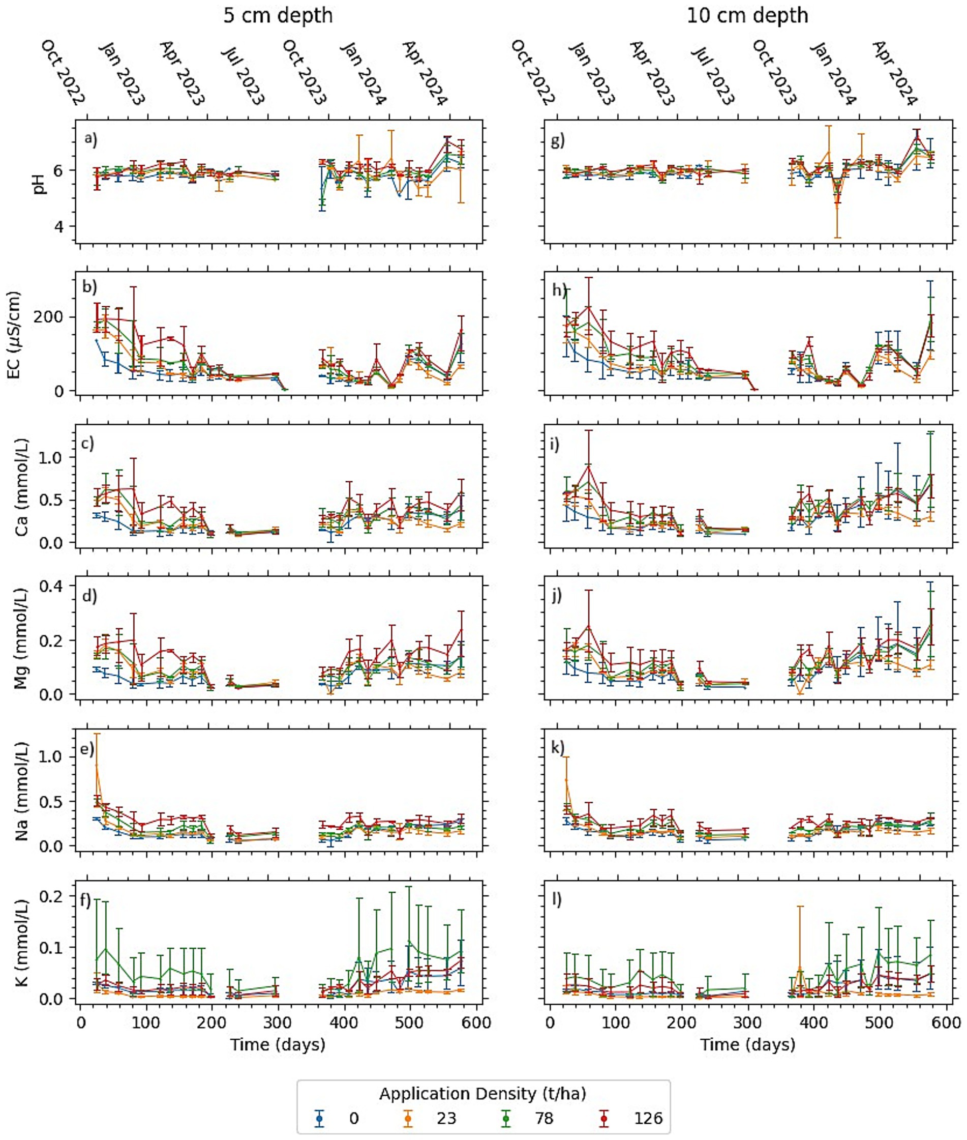 Largely, higher calcium, magnesium and sodium concentrations were identified in basalt amended treatments (e.g., 126 > 78 > 23 > 0 t ha−1). This trend is also evident in the magnesium and sodium time series, relative to calcium (Figures 3C–E,I), indicating weathering. Calcium concentration is often more variable in soils (Dietzen and Rosing, 2023), which could explain the greater variance in the measured calcium concentrations in the pore water. EC data also broadly follows the same trend of values in the plots that received basalt amendment (Figures 3B,H), indicating a measurable contribution of ions introduced by basalt weathering to the ionic strength of pore water solutions. Potassium concentrations are consistently higher and more variable at any given time point in the 78 t ha−1 treatment relative to all the other treatments (Figures 3F,L). Variation in the 78 t ha−1 treatment was most likely the result of the natural and unexplained variability of one rhizon. Variability in K concentrations were not identified in baseline soil samples (Section 2.2).