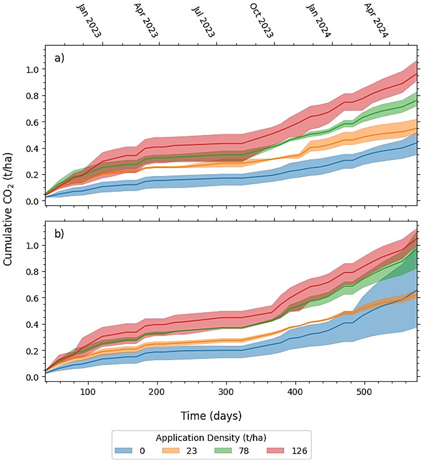 Given that the study duration is 1.5 years, the statistically significant CDR observed, ranging between 0.33 and 0.53 tCO2 ha−1 over c.1.5 years of weathering, as well as the linearity observed, may evolve over longer timeframes. Initial weathering rates tend to be higher due to the dissolution of finer particles and higher SSA asperities (e.g., Power et al., 2025). However, the detection of weathering signals may experience a time lag, as cations can initially be absorbed onto exchange sites, with a greater fraction of the weathering products remaining in pore water after several years (Kanzaki et al., 2024). The results presented in this study, therefore, should be considered as site- and time-specific. Additionally, the application of 78 or 126 t ha−1 of rock amendment, where significant CDR is observed, are not operationally applied to agricultural land.