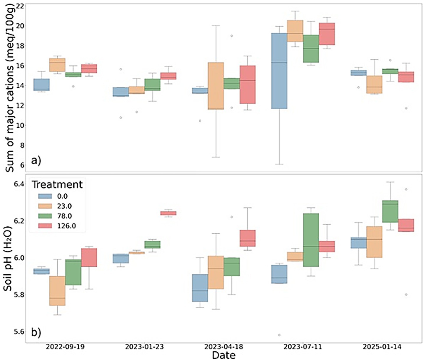 Figure 5. Sum of major cations (calcium, magnesium, potassium and sodium) in meq 100 g−1 in each plot and for each soil sampling event (a) pH (determined on a 1:2.5 ratio of soil to H2O; (b).