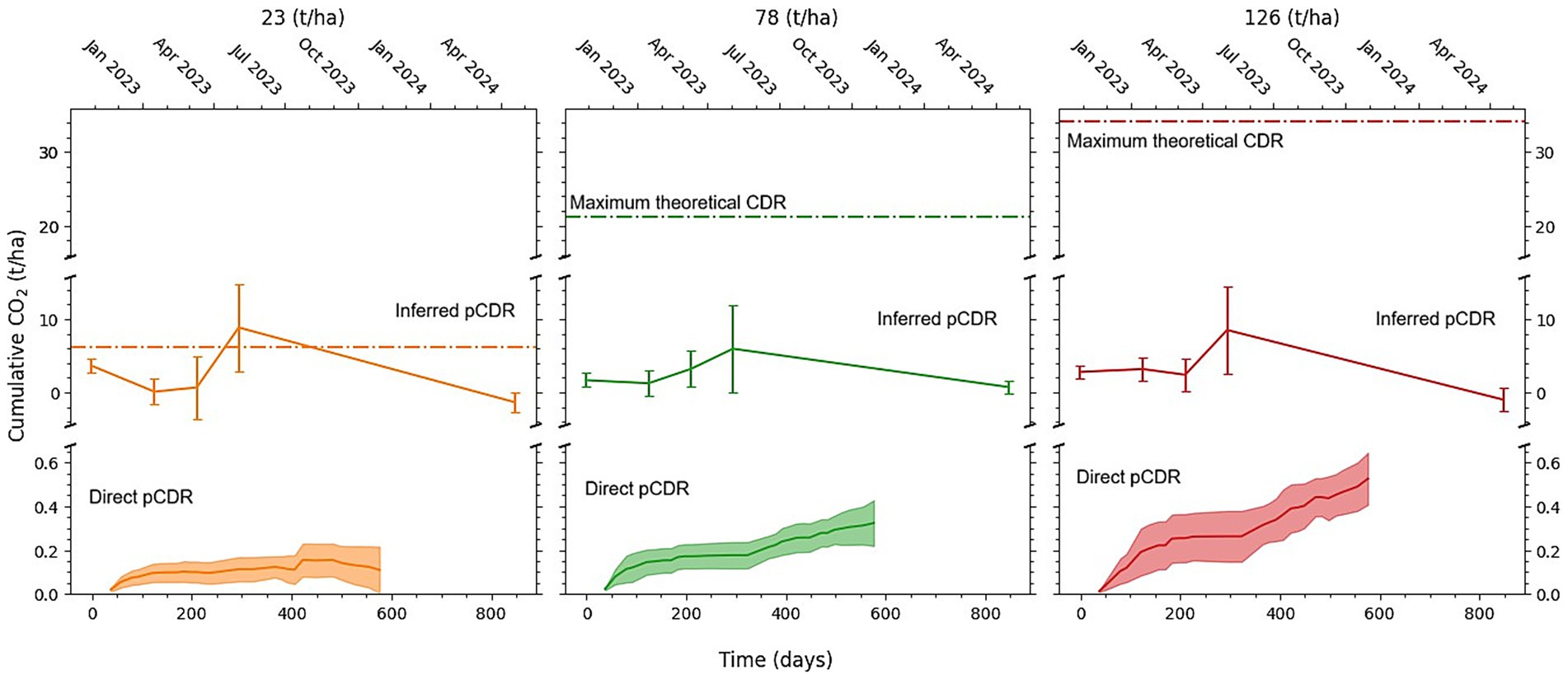 Integrating daily P-ET fluxes with measured porewater concentrations at 5 and 10 cm depth over 1.5 years of weathering showed that direct pCDR increased linearly with application density of crushed basalt. Direct pCDR of up to 0.53 tCO2 ha−1 was observed when 126 t ha−1 basalt was applied to grassland soils, when no deductions are applied. This meant the equivalent of 4.2 kgCO2 tRock−1 ha−1 (0.0042 tCO2 ha−1 tRock−1) were potentially removed following 1.5 years of weathering. These values are c. 2 orders of magnitude lower than the theoretical maximum CDR—confirming that maximum theoretical CDR is not a useful indicator of CDR over short timescales but can serve as a useful tool to compare the potential of different feedstocks. Although direct pCDR measured from porewater sampling is the most direct measure of CDR via EW, discontinuous sampling methods could underestimate pCDR. However, slower weathering feedstocks could be significant over decadal (e.g., 20-year) timescales though extended time-series of EW studies would be required to investigate this. The results presented in this study represent data after 1.5 years of weathering, where the faster weathering particles and minerals are likely to have preferentially dissolved, and both CDR rates and trends may be differ over longer durations. Finally, data presented in this study suggests that detecting signals in slow weathering materials can be challenging, particularly at lower application densities, but aided by high-frequency and/or time integrated measurements.