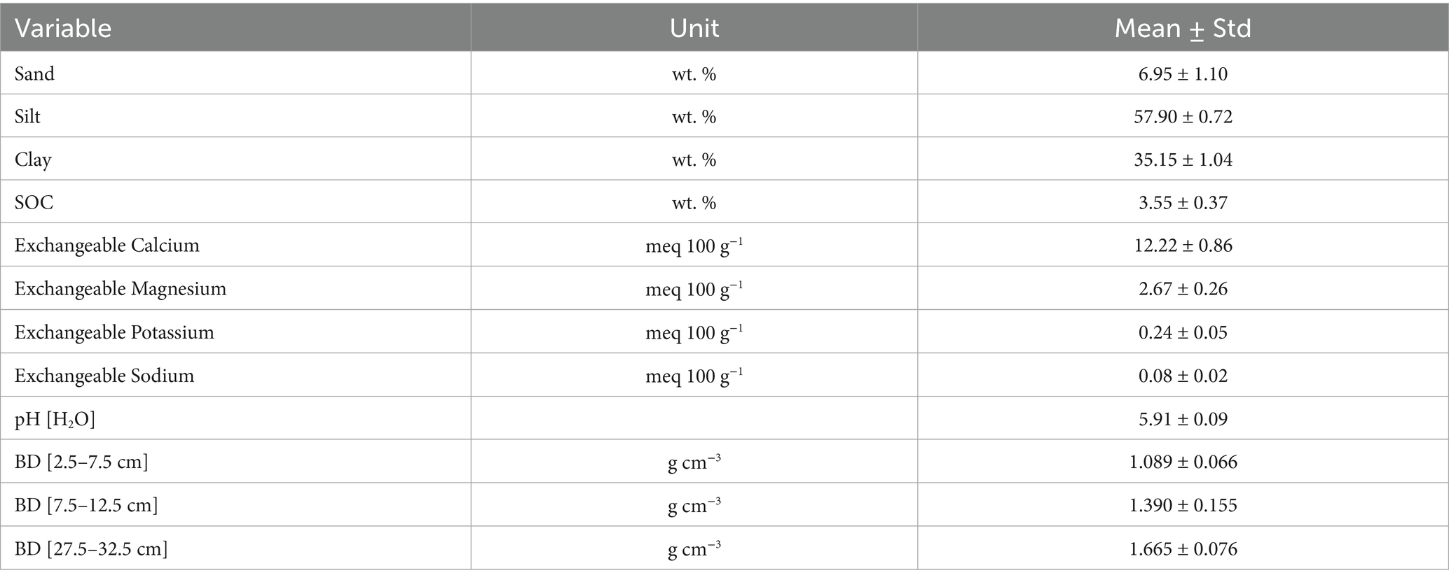 Table 1. Mean and standard deviation of baseline soil sample results for soil texture (sand, silt, clay), soil organic carbon content (SOC), exchangeable calcium, magnesium, potassium and sodium, soil pH determined on a 1:2.5 ratio of soil and deionized water, bulk density (BD) in three different depths (5, 10 and 30 cm).