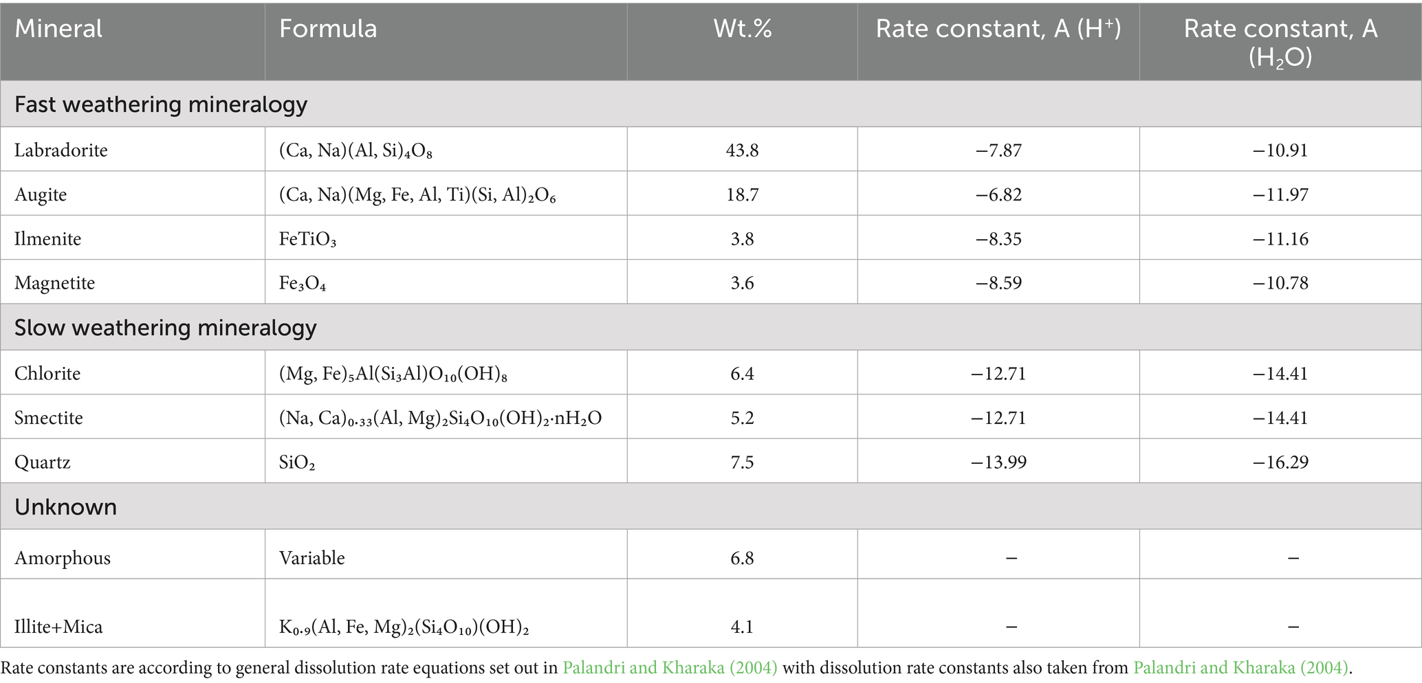 Table 2. Measured rock mineralogy, accompanied by log-dissolution rate constants for the acidic (H+) and neutral (H2O) dissolution rate mechanisms at 25°C.