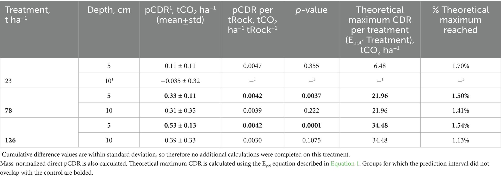 Direct pCDR from cumulative porewater was significantly explained by the application of basalt in both 5 and 10 cm depth (OLS r2 = 0.912 and r2 = 0.56 for 5 and 10 cm, respectively), at the end of the 1.5 year long porewater time series. Where the prediction intervals for treatments did not overlap with the control in the 5 cm sampling depth (78 and 126 t ha−1), linearity is observed between the tons of rock applied and percentages of CDR (Table 3) with mass-normalized-pCDR of 0.0042 tCO2 ha−1 tRock−1.