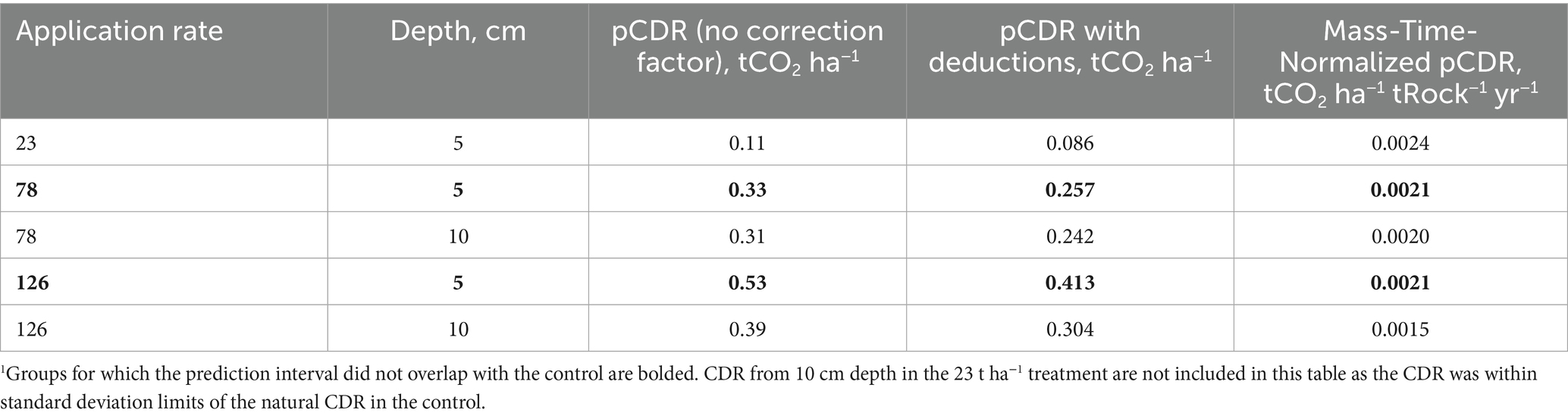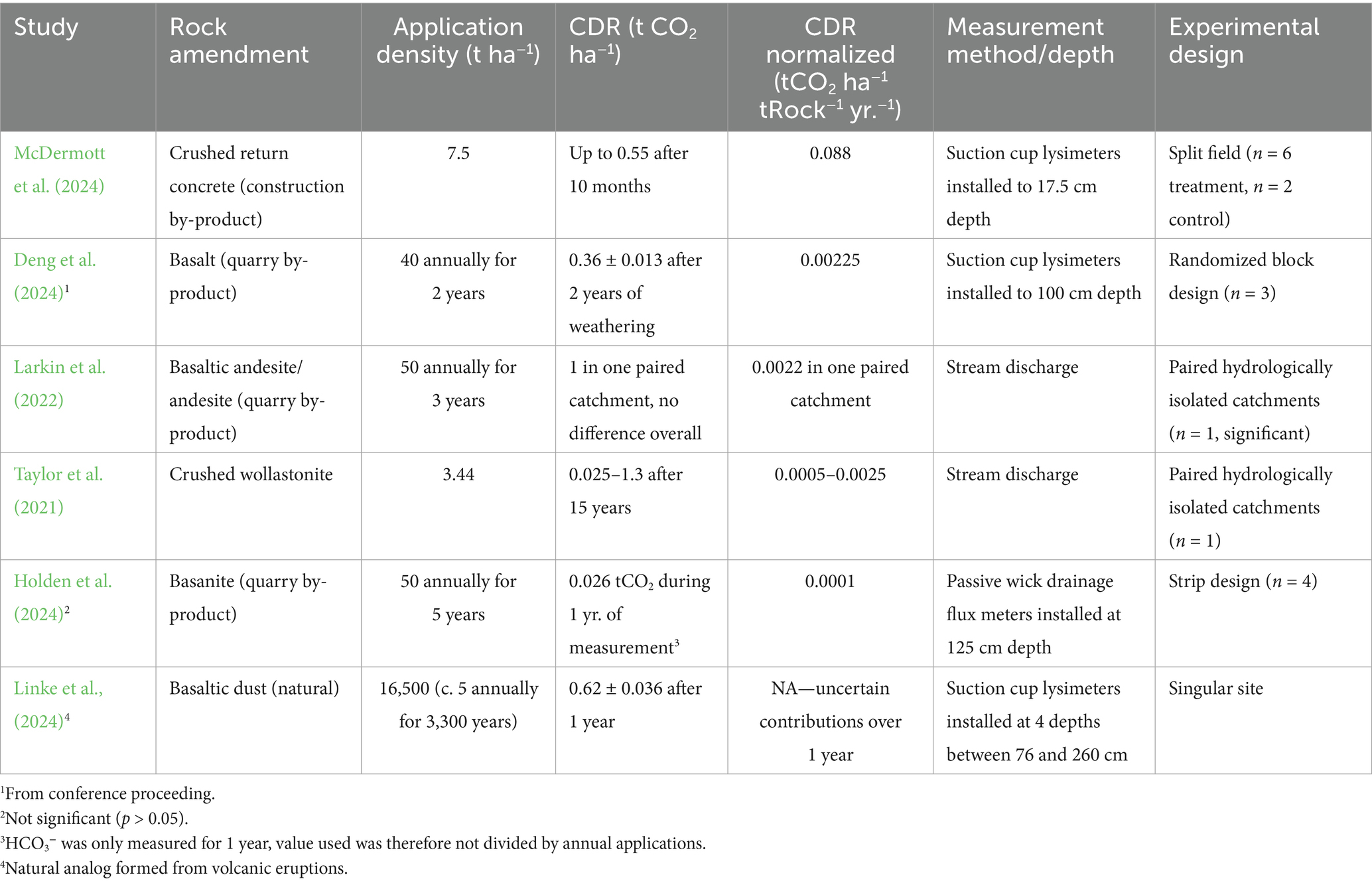The time-mass-normalized direct pCDR reported in this study (0.0021 tCO2 ha−1 tRock−1 yr.−1, including deductions) is within the midrange of time-mass-normalized results reported in Table 5 (0.001–0.088 tCO2 ha−1 tRock−1 yr.−1). The study took place in temperate climates, using relatively slow weathering feedstocks (e.g., basalt). Other feedstocks, such as wollastonite, and regions with warm, wet summers, would likely lead to faster weathering rates, as per common consensus on dissolution kinetic laws (e.g., Palandri and Kharaka, 2004). However, slower weathering feedstocks could be significant over decadal (e.g., 20-year) timescales and this study suggests that while detecting signals in slow weathering materials can be challenging, particularly at lower application densities, it is achievable via high-frequency and/or time integrated measurements.