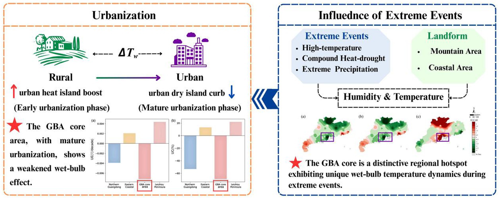 To address these gaps, this study focuses on Guangdong Province in China (encompassing Guangdong-Hong Kong-Macao Greater Bay Area, GBA) as a case study of a humid and highly urbanized region. First, we use long-term meteorological and urban development data to quantify the urban–rural WBT difference, evaluating the effect of urbanization. Second, we quantitatively assess how extreme events, namely heatwaves, compound heat-drought events, and extreme precipitation, alter this effect. Finally, we investigate the combined effect of urbanization and extreme weather on the urban–rural WBT differences, providing insights for developing climate-adaptive strategies in humid urban agglomerations.