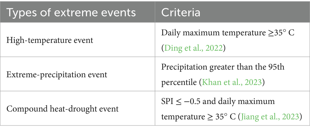 We focused on three types of extreme events, namely high temperature, extreme precipitation, and compound heat-drought events, which were identified to assess the changes in WBT during these periods relative to normal non-event conditions. The specific criteria for these events are presented in Table 1.