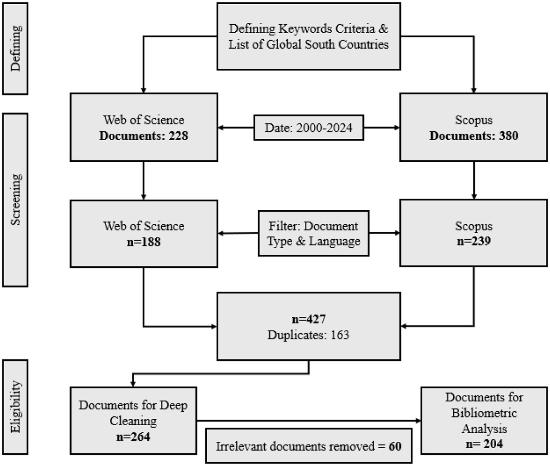 A list of 134 Global South countries was obtained from House of Commons Library to guide the data extraction process. The following criteria keywords, “climate migration*” OR “environmental migration*” OR “climate-induced migration*” OR “climate displacement*” OR “environmental displacement*” OR “climate refugee*” were combined with the list of the Global South countries to retrieve the scientific data on climate-induced migration from 2000 to 2024 (see Annex 1). The variation among keywords was maintained by using asterisk (*) after each keyword. For instance, “climate migration*” results in “climate migration” and “climate migrations” (WoS Help, 2020). The search was conducted on March 05, 2025.