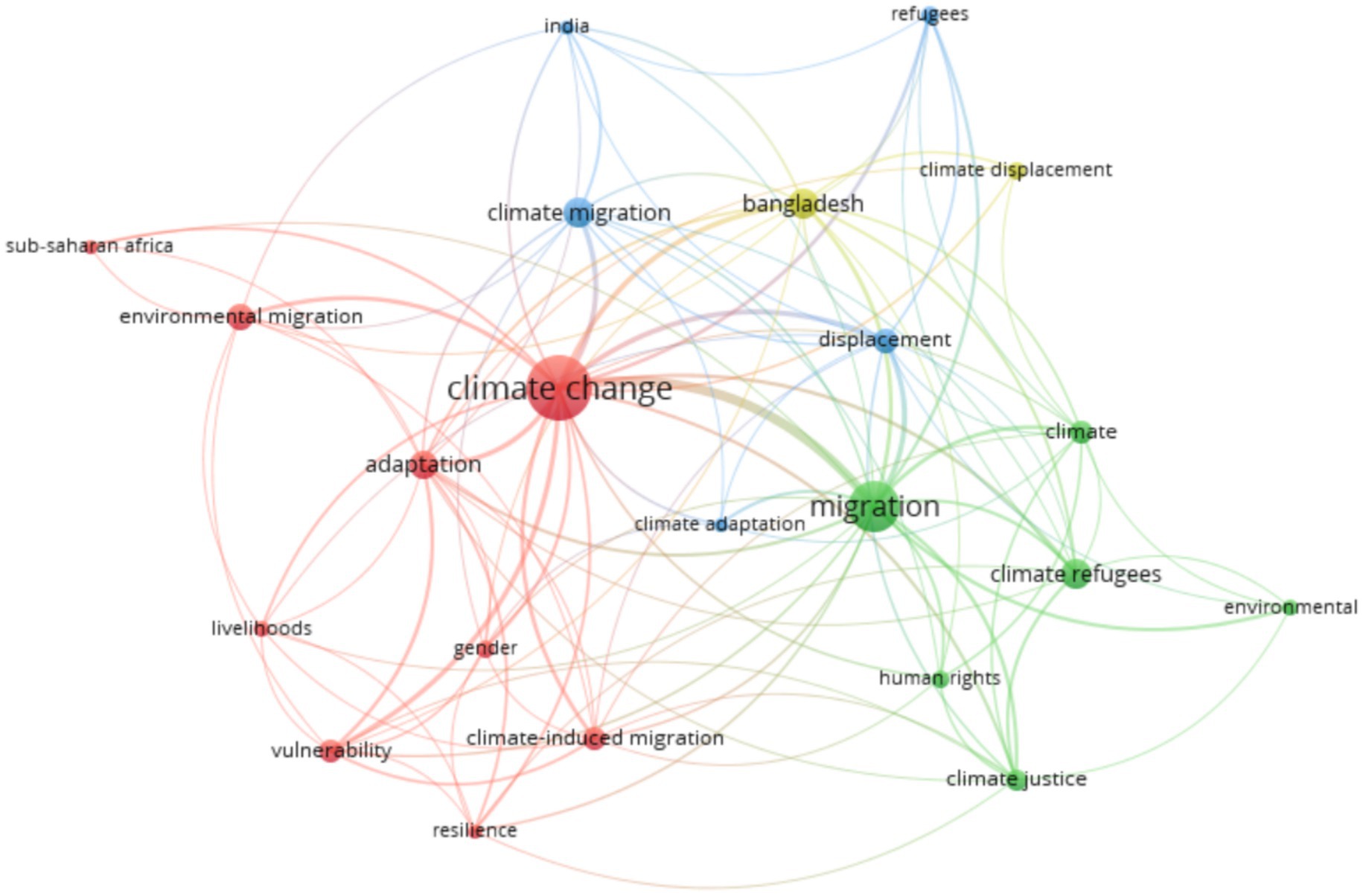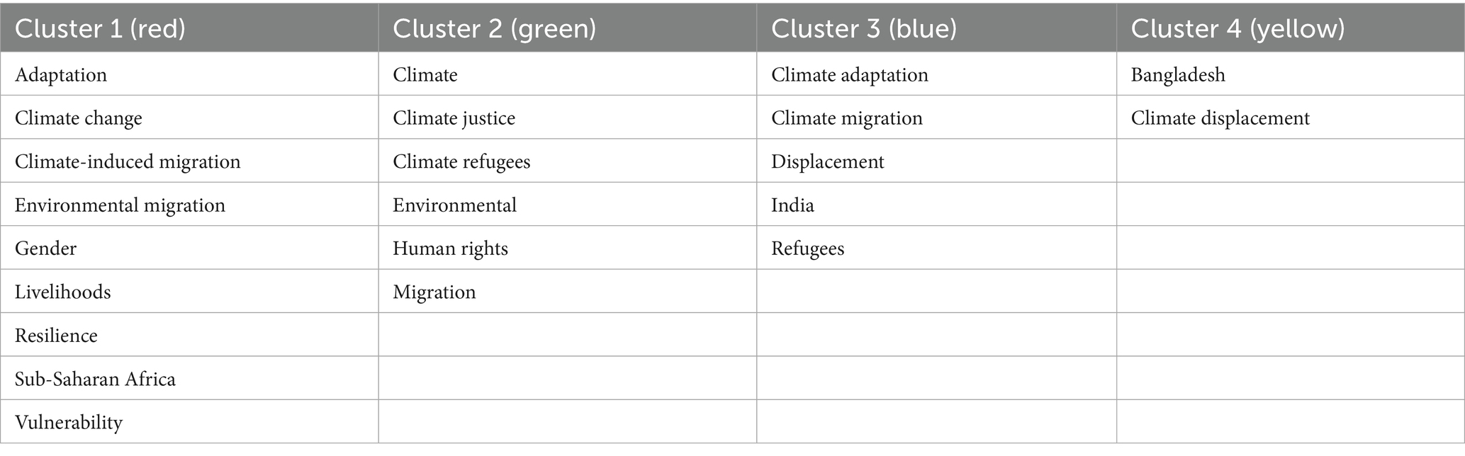 Figure 2 and Table 2 present a co-occurrence network of author keywords, illustrating four thematic clusters that define the intellectual structure of climate-induced migration research. The red cluster centers on climate change, adaptation, and vulnerability, interlinked with gender, livelihoods, resilience, and Sub-Saharan Africa. This grouping emphasizes justice-oriented concerns around exposure, coping capacity, and intersectionality, especially in Global South contexts (McLeod et al., 2018; Radel et al., 2018). The green cluster focuses on migration, climate refugees, climate justice, and human rights, highlighting a normative and rights-based turn in the field that critiques securitized framings and foregrounds dignity, equity, and historical responsibility (Bettini et al., 2017; Mayer, 2016; Berchin et al., 2017). Together, these clusters reflect a broadening of the field from empirical assessments of mobility to ethical and legal frameworks, signaling increasing alignment with the principles of climate justice.