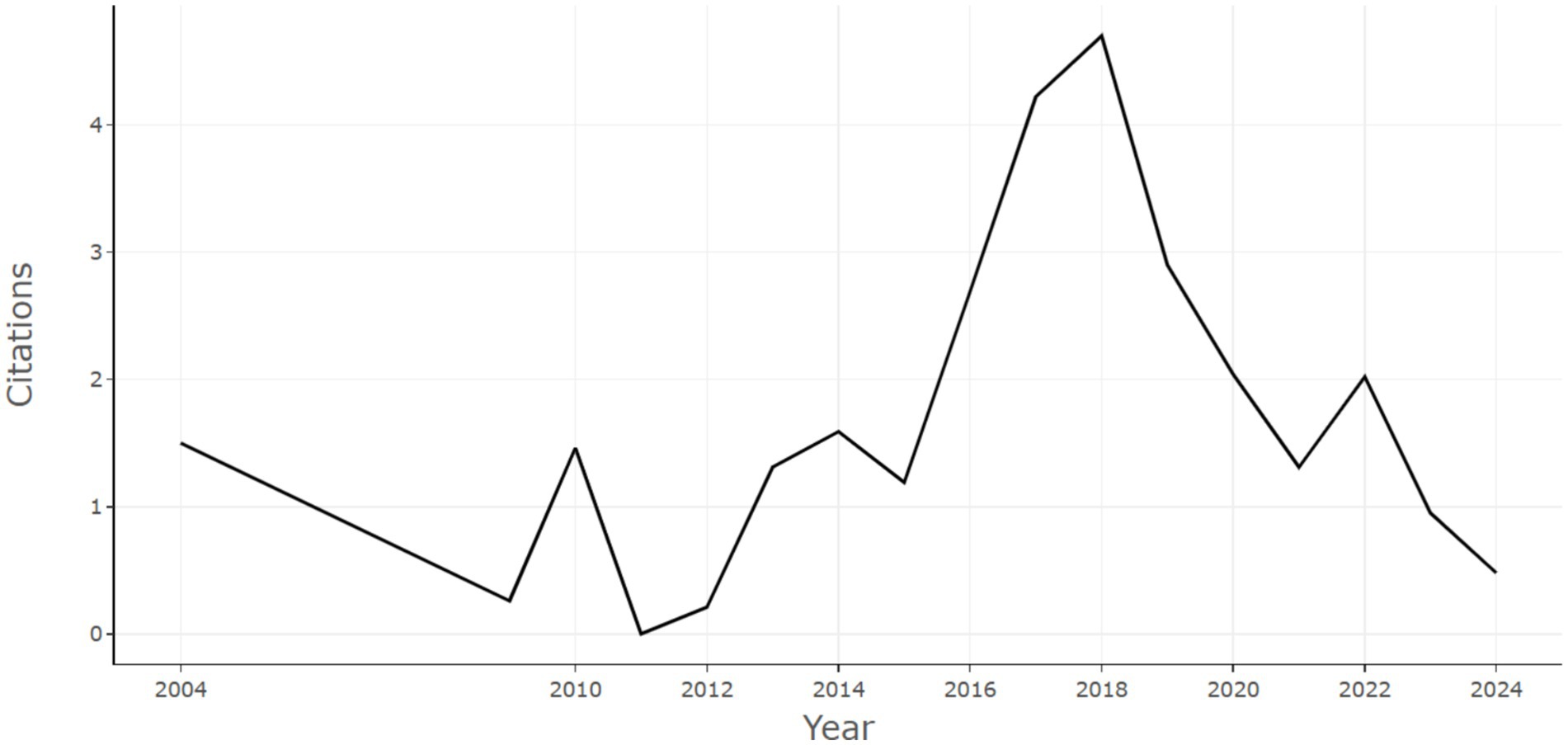 Figure 3 illustrates the average number of citations per document from 2004 to 2024. Citations increased steadily after 2012 and reached a peak around 2018. However, this was followed by a gradual decline, as indicated by the downward trend. This also shows that newer publications have yet to accumulate citations. During the peak in 2018, there were 4.70 total citations, which has reduced to 0.48 in 2024. The post-2018 decline reflects citation lag rather than waning interest; importantly, it also flags enduring citation inequities, newer Global South scholarship published since 2020 has had less time and fewer channels to accrue recognition, a phenomenon central to epistemic justice debates.” (cf. Donthu et al., 2021; see also our discussion of asymmetries).
