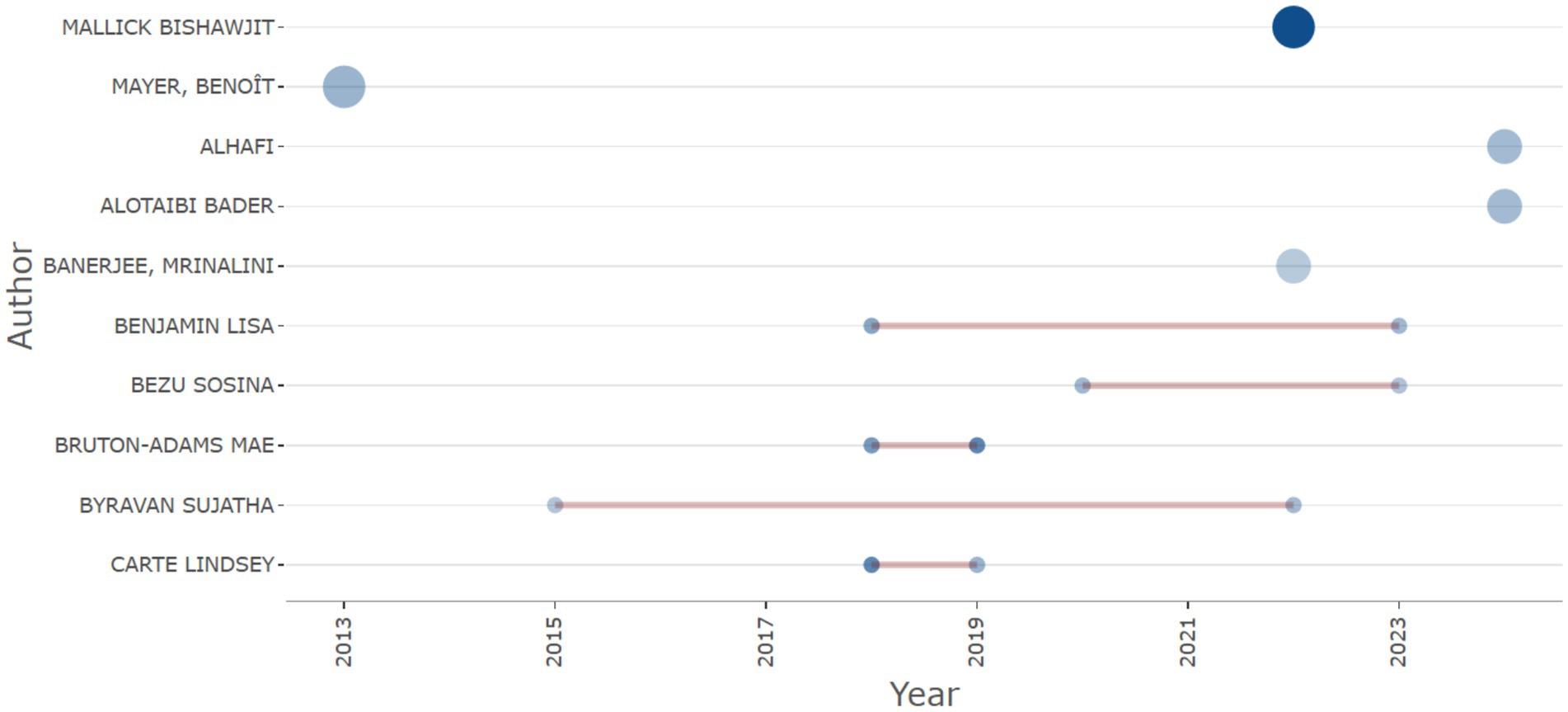 Figure 4 maps the temporal publication activity of the top 10 most productive authors in climate-induced migration research, revealing patterns that reflect broader climate justice dynamics in academic knowledge production. Mallick Bishawjit emerges as the most prolific recent contributor, especially post-2019, through his empirically grounded work in South Asia, emphasizing justice-centered adaptation and relocation (Mallick and Etzold, 2015; Mallick and Schanze, 2020). Mayer Benoît, a key contributor in 2013, remains influential for pioneering legal critiques of refugee protection gaps under climate stress (Mayer, 20132016). Authors like Byravan Sujatha and Bezu Sosina have maintained sustained contributions; Byravan’s research advocates for dignity in planned relocation (Byravan and Rajan, 2015), while Bezu’s Ethiopia-focused work reveals intersectional vulnerabilities in youth and smallholder migration (Bezu and Holden, 2014). Emerging scholars such as Banerjee, Bruton-Adams, and Carte reflect a recent diversification of themes and perspectives, particularly those aligned with feminist and postcolonial approaches (McLeod et al., 2018; Morrison et al., 2023).