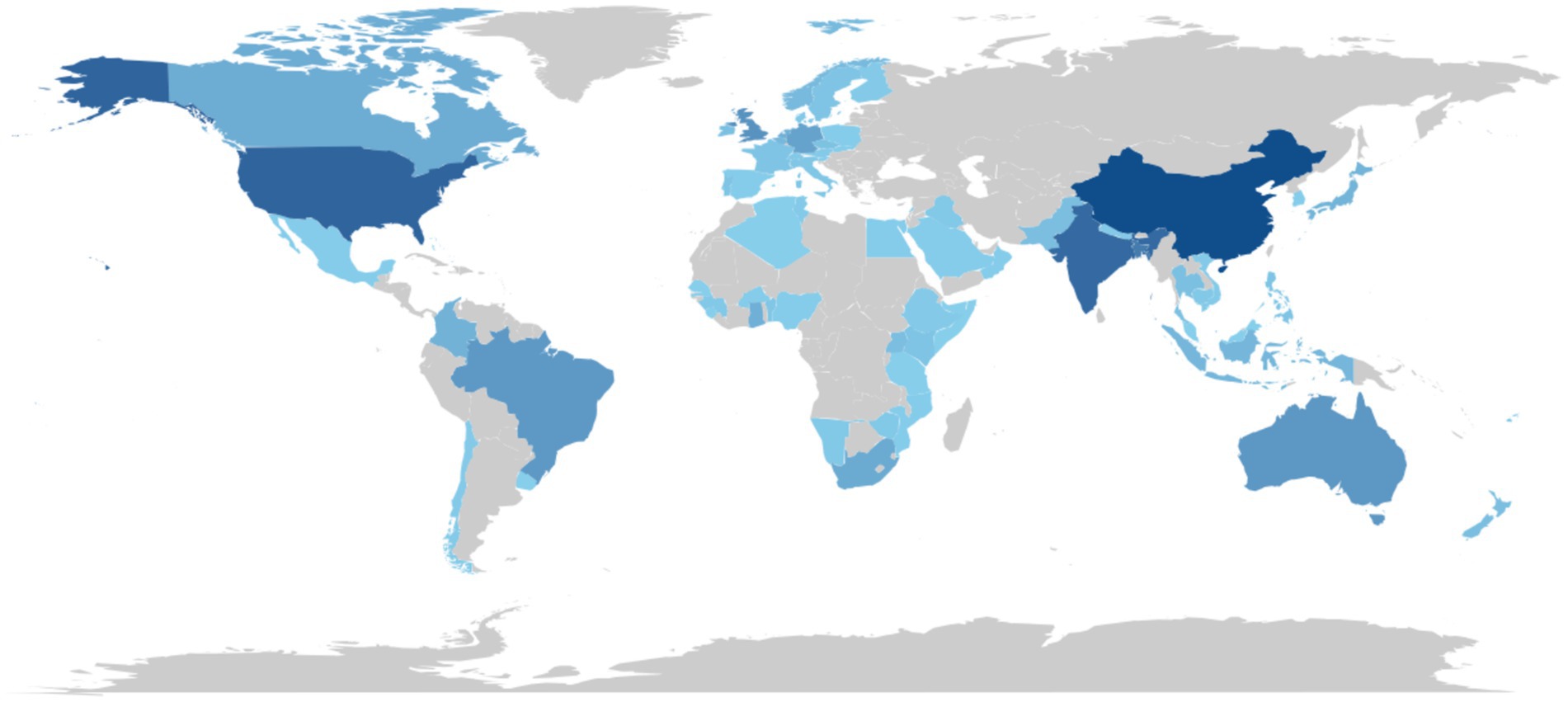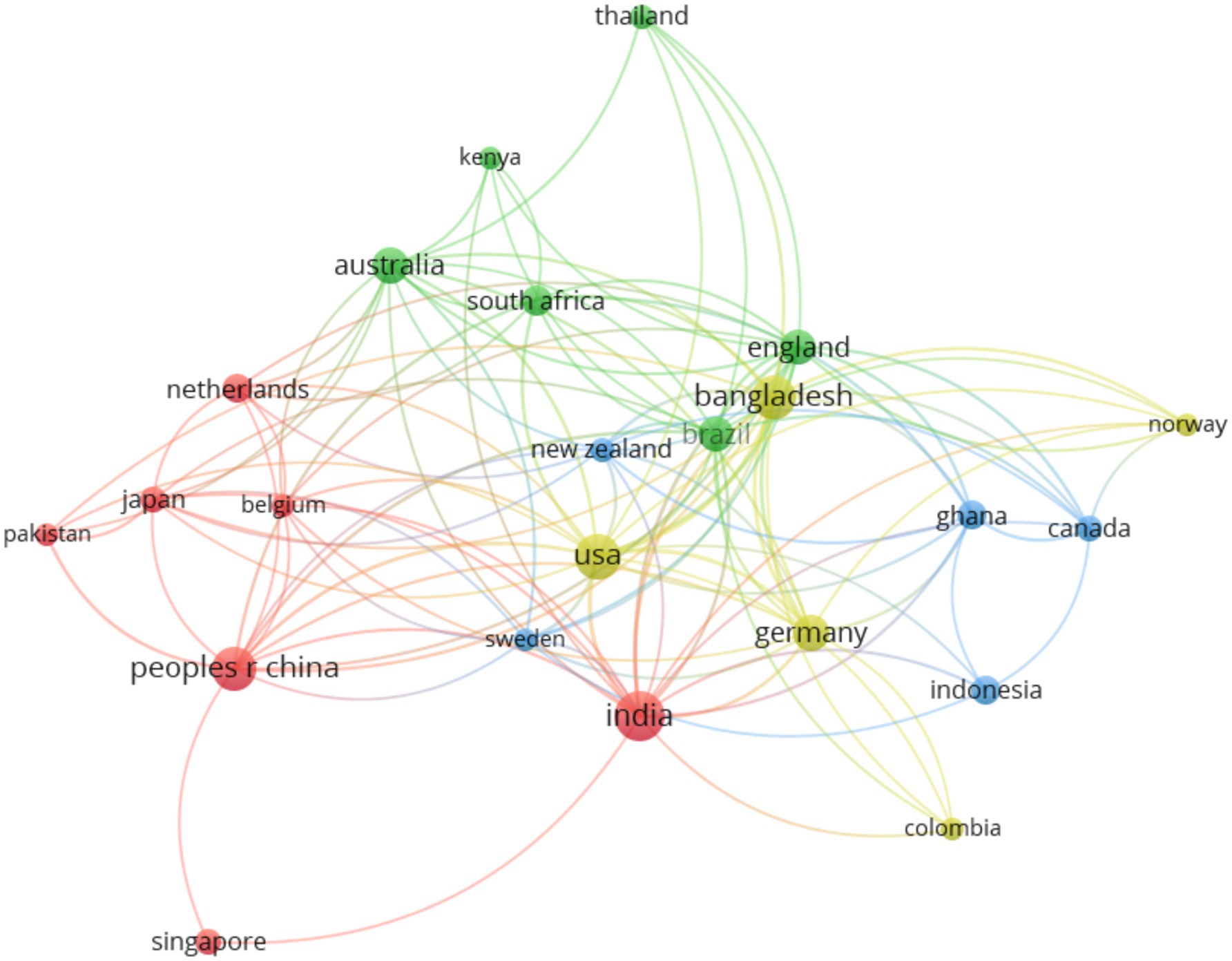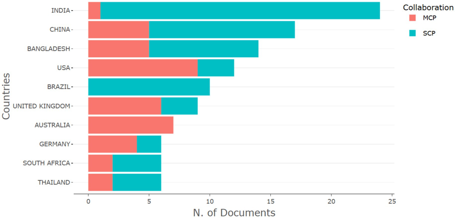 Figure 5 shows the number of articles published by corresponding authors from different countries. MCP refers to Multiple Country Publications and SCP refers to Single Country Publications. The highest number of corresponding authors is recorded from India and China. Authors from India, China, Bangladesh mostly published as single country publications, whereas the USA, UK, and Germany have a higher proportion of multi-country collaborative research. Notably, all corresponding authors from Brazil have published exclusively through SCP, whereas those from Australia have contributed solely to MCP publications. Interestingly, authors from Global North countries are more involved in international collaborations compared to authors from the Global South.