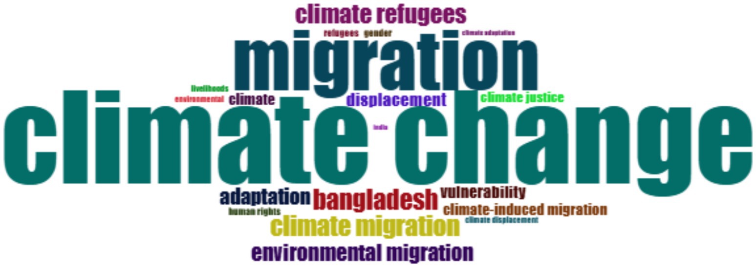 Climate change is found to be the most dominant keyword in our dataset which appeared 87 times. After that migration occurred 56 times and climate migration accrued 19 times. The use of other terms such climate refugees, environmental migration, displacement, adaptation, vulnerability and climate justice indicates that discussion is not limited to just migration but also the coping mechanisms, risks, and resilience and aftermaths. The use of these keywords increased drastically after 2018. Interestingly, keyword ‘Bangladesh’ occurred 19 times, which shows its significance as a key study area in climate migration.