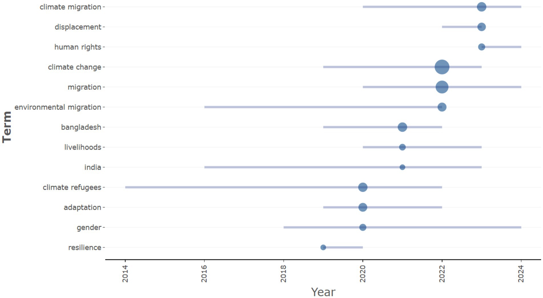 Figure 9 shows the temporal evolution of key topics in climate migration research, based on author keywords. Horizontal lines indicate years during which a specific term has been actively used in the literature, while the bubble size represents the frequency of occurrence. Environmental migration and climate refugees were among the earliest used terms to appear in research. The last few years have seen a surge in terms such as climate migration, displacement, and human rights. Much of the focus is being placed on the legal and social dimensions of climate-induced migration. Newer themes such as resilience, gender, adaptations and human rights are gaining greater attention.