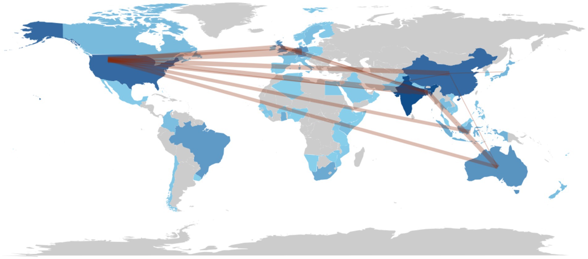 Though countries like China, India, and Australia are emerging as productive contributors, the figure shows limited South–South collaboration, with most research partnerships still mediated through Global North institutions such as those in the USA, UK, and Germany. This reflects broader critiques in climate justice and development literature regarding the lack of horizontal, equitable research networks among Global South regions, which share similar climate vulnerabilities and socio-political constraints but are rarely given space to collaborate directly (Milán-García et al., 2021; Morrison et al., 2023). For instance, despite their shared experiences with displacement and adaptation, countries like Bangladesh and Kenya, or India and the Philippines, are rarely seen in direct collaboration. Addressing this gap is crucial not only for ensuring context-sensitive and inclusive research, but also for empowering Southern institutions to reshape the theoretical, methodological, and policy discourse on climate migration from within. Moving forward, fostering South–South knowledge solidarity and challenging North-led epistemic dominance must be central to a climate justice-informed research agenda.