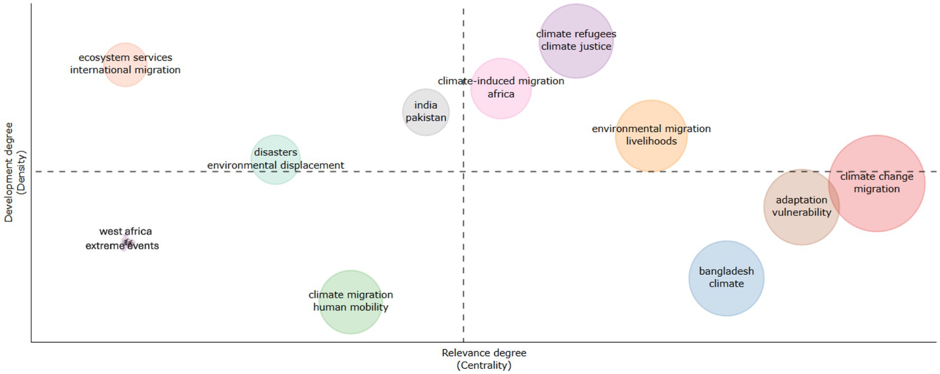 Motor Themes located on the upper right quadrant are well-developed and highly relevant, central, and dense themes. Keywords such as climate change migration, adaptation, vulnerability, and environmental migration with livelihoods. These themes advance discourse and reflect core policy and resilience strategies.