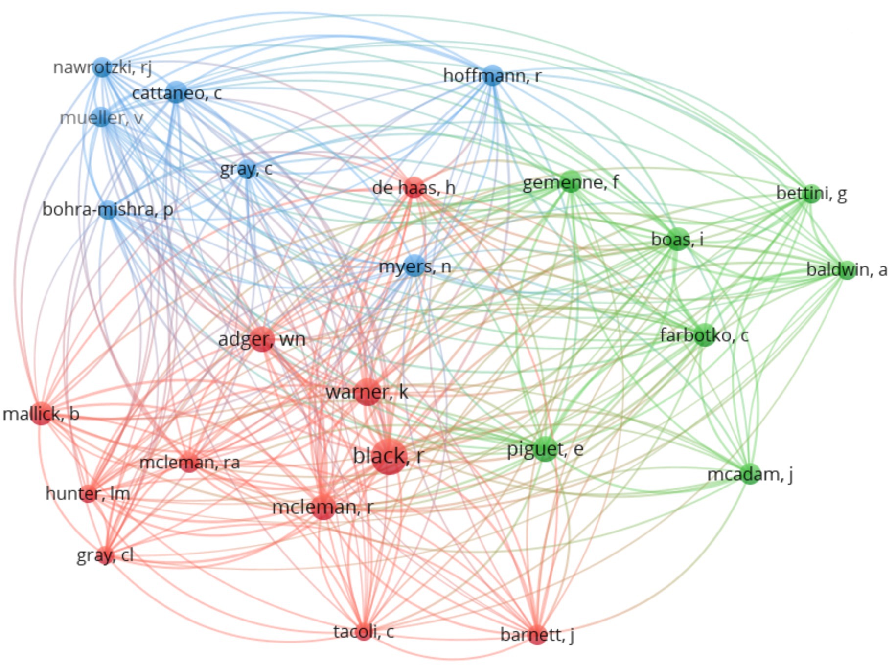 In contrast, the blue cluster, comprising authors such as Cristina Cattaneo, Clark Gray, Raphael Nawrotzki, and Valerie Mueller, is characterized by quantitative, empirical approaches. These scholars have contributed rigorous econometric and demographic analyses of migration drivers, often linking temperature variations, rainfall shocks, and agricultural productivity with mobility outcomes (Cattaneo and Peri, 2016; Nawrotzki and DeWaard, 2016). While this work provides essential insights into causality and migration decision-making, it has been critiqued by justice scholars for sometimes lacking contextual depth and critical engagement with political structures (Bettini et al., 2017). Nonetheless, the increasing integration of these empirical approaches with justice-oriented frameworks holds promise for evidence-based, policy-relevant, and ethically grounded research.