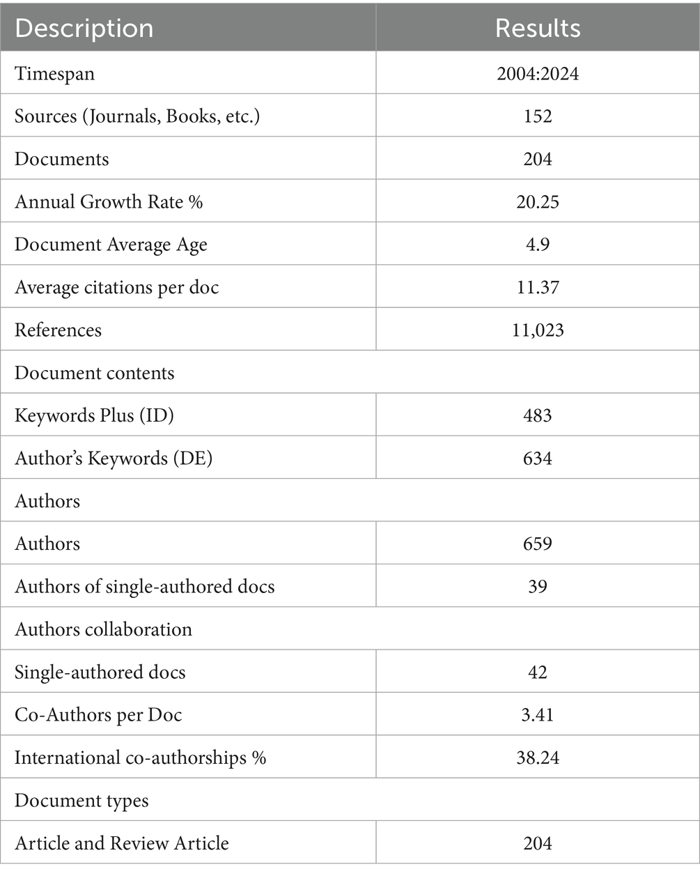Our dataset consists of 204 documents that come from 152 sources and include 659 authors. The annual growth rate of publication was 20.25%. Notably, only 42 documents were authored by a single researcher which indicates a strong trend toward collaborative research. The dataset includes 634 author keywords which encapsulate a wide range of topics within climate-induced migration. The earliest publication in the dataset dates back to 2004, and 40 articles were published in 2024. Although the publication frequency remained relatively gradual until 2012, a substantial growth has been observed since 2017.
