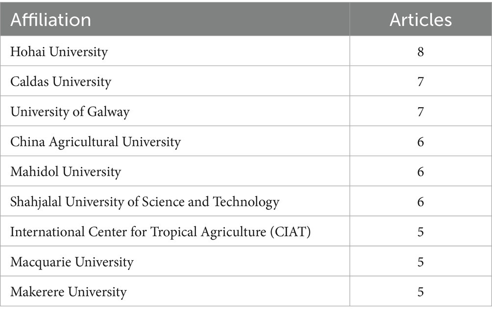 Table 3 presents the publications by top affiliations. In the top 10 relevant affiliations, Hohai University ranks 1st with 8 articles, followed by Caldas University and University of Galway with 7 articles each. Makerere University remains in 10th position with the contribution of five articles. Institutions from both the Global South and North are found to be equally engaged in climate migration research. The first publication from Hohai University was registered in 2022, and by 2023 it had published a total of eight articles. Notably, the activity around climate migration has intensified after 2018.