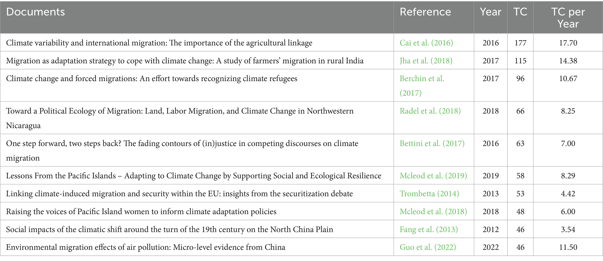 Table 5 highlights the distribution of influential journals in climate-induced migration research, revealing both the visibility of the field and the dynamics of knowledge dissemination. From a climate justice perspective, the presence of journals such as Climatic Change, International Journal of Climate Change Strategies and Management, and Climate and Development—with a combined total of 17 articles and over 360 citations—indicates growing academic engagement with the complex interplay between environmental stressors, displacement, and human rights. Notably, the International Journal of Climate Change Strategies and Management stands out with only five publications but the highest total citations (202), suggesting that its content is especially impactful, likely due to its focus on adaptation strategies and policy integration, themes central to justice-oriented responses (Jha et al., 2018; Berchin et al., 2017).