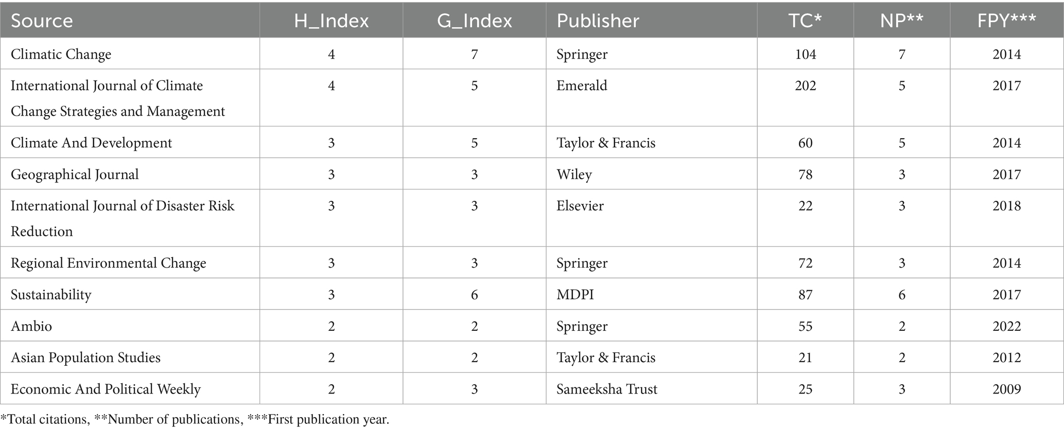 The dominance of mainstream publishers such as Springer, Taylor & Francis, and Elsevier, while reflecting academic rigor, also underscores concerns raised in climate justice scholarship about restricted access and global inequalities in publication visibility and affordability (Anjum and Aziz, 2025c; Arruda Filho et al., 2024). Journals like Sustainability (MDPI), which offer open access, are playing an important democratizing role with six publications and 87 citations, helping to amplify voices from the Global South and increase accessibility for underfunded institutions. Importantly, the inclusion of regionally focused journals such as Asian Population Studies and Economic and Political Weekly—both publishing fewer but impactful studies—illustrates efforts to engage with localized, community-based, and often underrepresented perspectives on migration and vulnerability (McLeod et al., 2018; Radel et al., 2018).