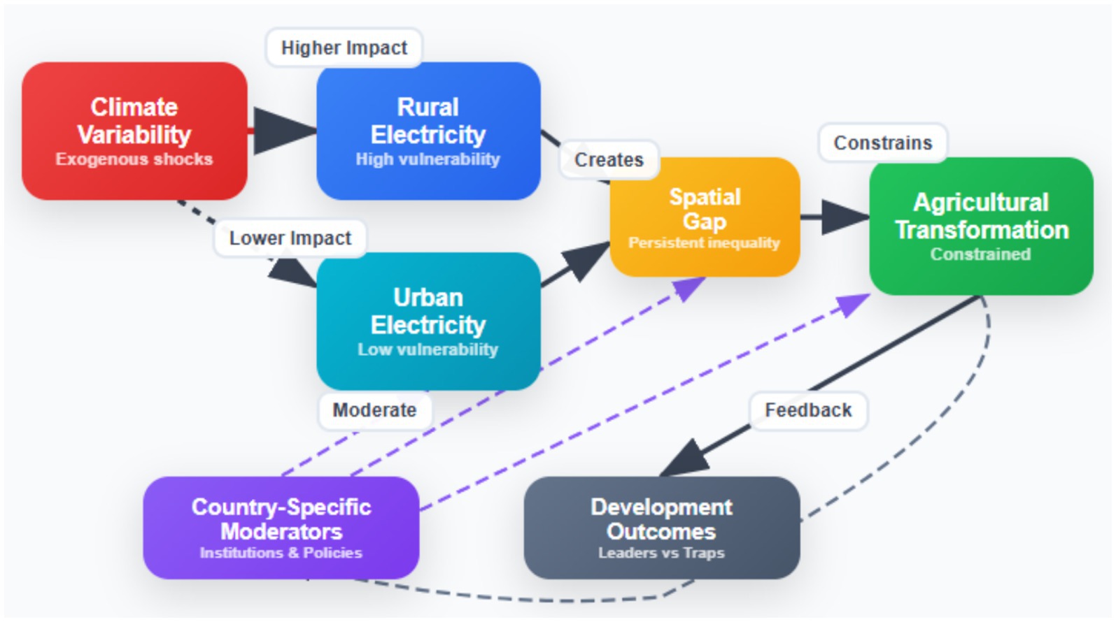 The framework anticipates that these differential climate vulnerabilities will create or widen rural–urban electricity gaps over time, rather than the convergence predicted by standard development theory. These spatial inequalities are expected to constrain agricultural transformation by limiting rural communities’ access to adaptation technologies such as irrigation, processing, and mechanization that require reliable electricity. Country-specific factors, including institutional capacity, policy frameworks, and geographic characteristics, are theorized to moderate these relationships, explaining potential variation in outcomes across EAC members. The framework also incorporates feedback mechanisms where agricultural productivity improvements could generate resources for infrastructure investment, creating either virtuous development cycles or poverty traps depending on initial conditions and institutional capacity.