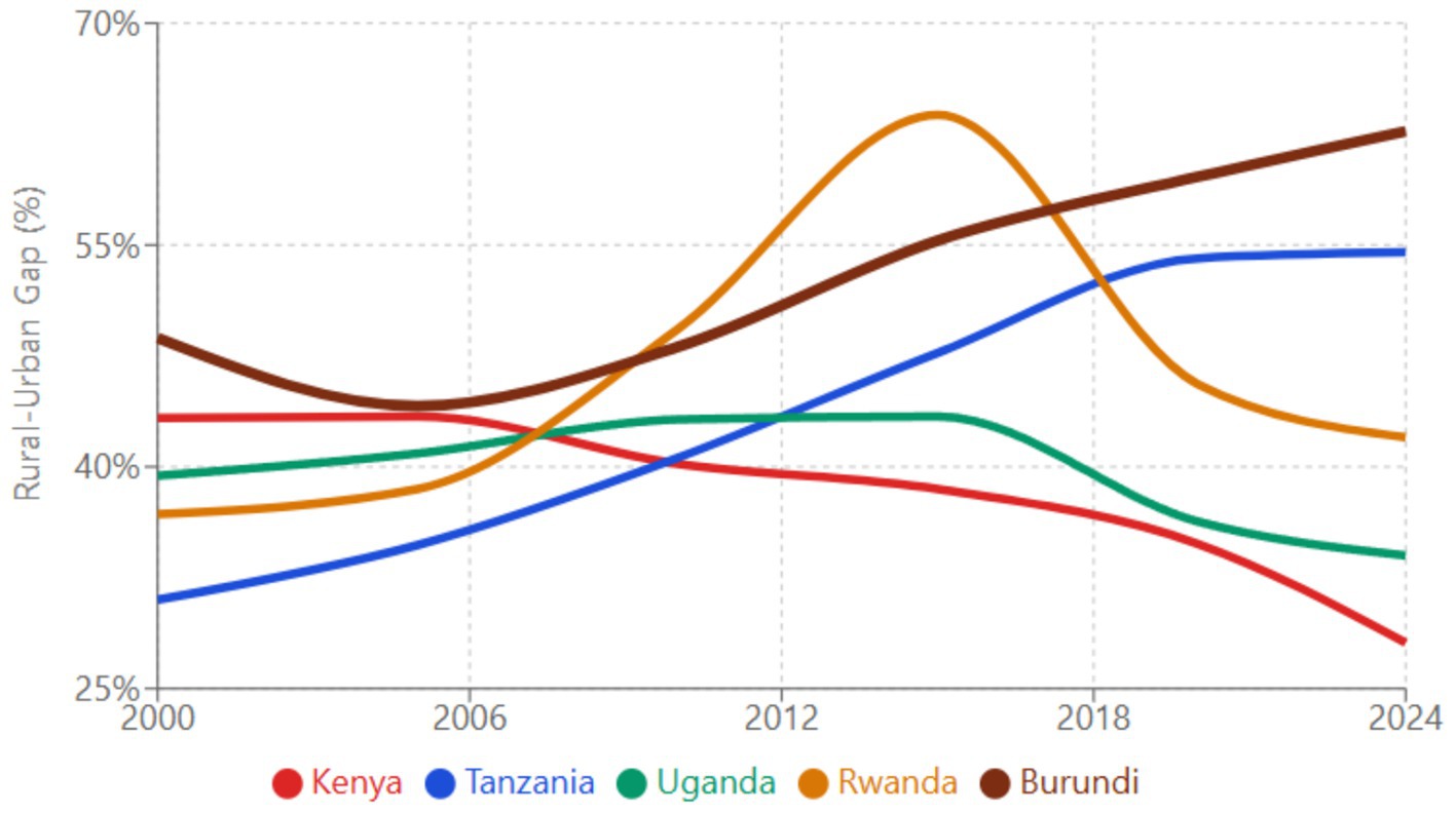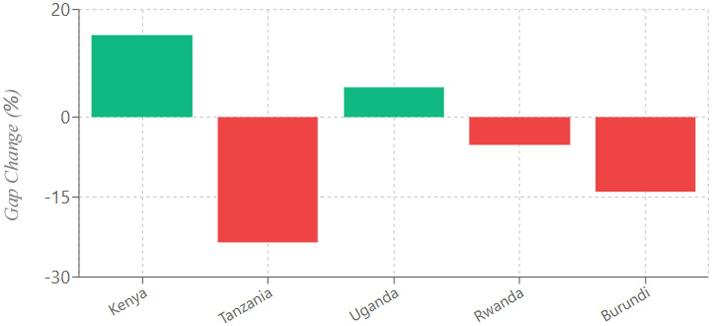 Other EAC members have shown mixed results. Burundi recorded a 14-percentage-point widening of its gap, while Tanzania’s increased by 23.5 points. Burundi’s prolonged political instability and structural economic fragility have constrained public investment and weakened institutional capacity, limiting progress in electrification and resilience-building (World Bank, 2024b). Uganda and Rwanda made modest progress, though their trends remain uneven.