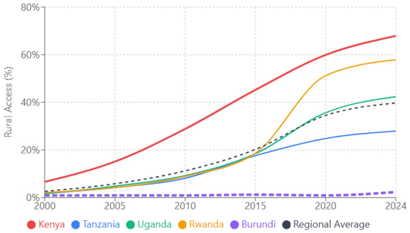 The cumulative effect of these different trajectories has created unprecedented inequality in rural electricity access across EAC members by 2024, challenging fundamental assumptions about regional integration and shared development. Figure 4 demonstrates the dramatic widening of rural electricity access disparities across the region. The spread between Kenya’s 67.9% rural access rate and Burundi’s dismal 2.3% represents a staggering 65.6 percentage point gap—a level of inequality that extends far beyond simple infrastructure differences to reflect fundamental variations in development capacity. This systematic divergence over time, shown by the increasing dispersion of country performance, provides compelling evidence against automatic convergence assumptions and highlights how initial advantages or disadvantages can become self-reinforcing without deliberate intervention.