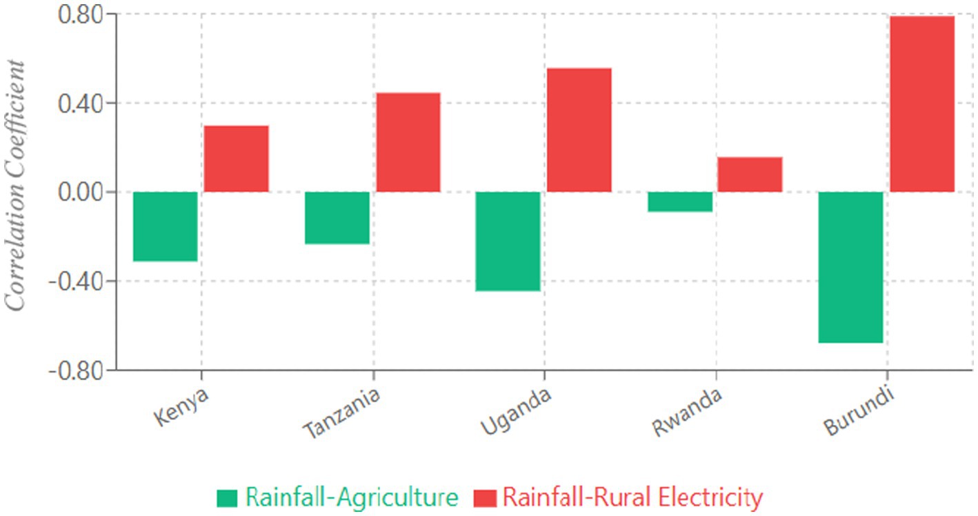 Figure 6 reveals how electricity access serves as a buffer against climate impacts on agriculture. Countries with better rural electrification, exemplified by Kenya, show weak correlations between climate variability and agricultural output, suggesting that reliable electricity enables farmers to adapt to climate shocks through irrigation, storage, processing, and other technologies. Burundi represents the opposite extreme, with a strong negative correlation of −0.678 between rainfall and agricultural output, reflecting the compound vulnerabilities facing farmers without access to basic adaptation infrastructure.