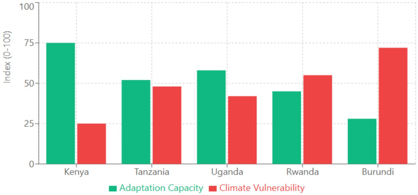 The adaptation capacity analysis in Figure 7 reveals stark contrasts in countries’ ability to use electricity infrastructure for climate resilience. Burundi exhibits the lowest rural adaptation capacity (28 index points) combined with the highest climate vulnerability (72 points), while Kenya demonstrates the highest adaptation capacity (75 points) with the lowest vulnerability (25 points). This inverse relationship validates arguments that energy infrastructure must be coupled with adequate institutional capacity to yield effective adaptation outcomes, with electricity serving not merely as a development input but as critical climate adaptation infrastructure.