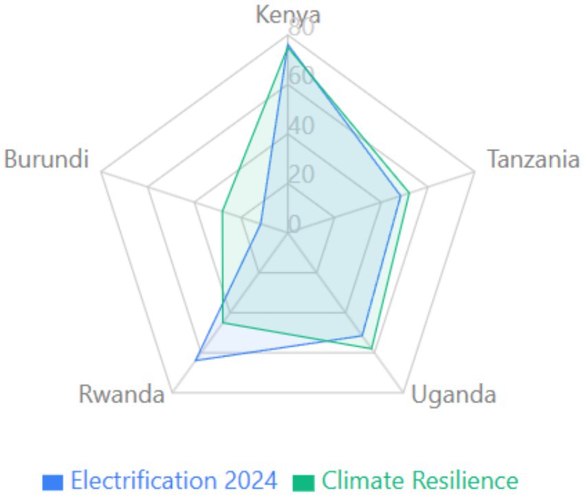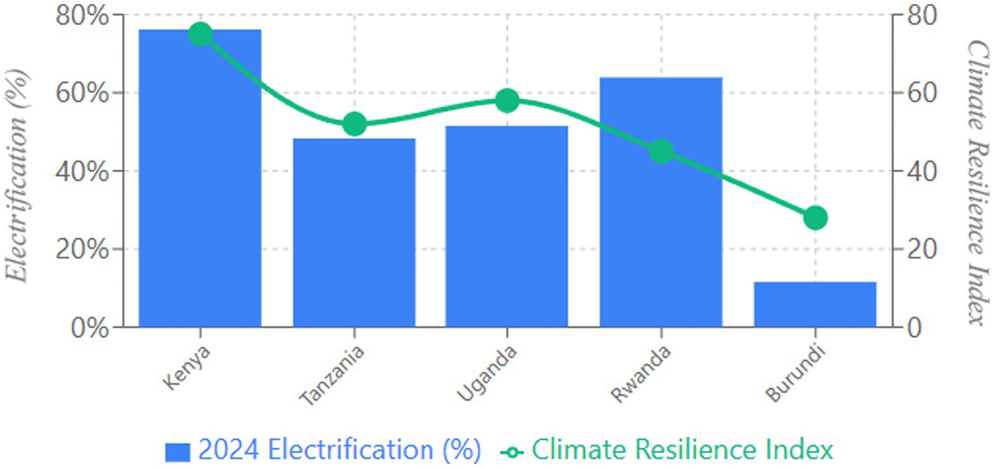 Figure 11 demonstrates the systematic relationship between electrification levels and climate adaptation capacity across EAC members. Countries with higher electrification rates consistently show superior climate resilience indicators, with Kenya’s position indicating particularly successful integration of development and adaptation objectives. The strong positive correlation supports arguments for integrated development-adaptation planning that recognizes co-benefits between infrastructure investment and climate resilience, challenging conventional approaches that treat electrification and climate adaptation as separate policy domains.