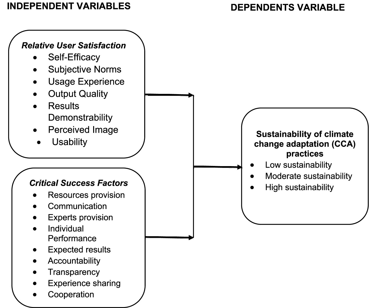 The conceptual framework presented in Figure 1 integrates Relative User Satisfaction (RUS) indicators and Critical Success Factors (CSFs) with the sustainability of Climate Change Adaptation (CCA) practices. In this study, sustainability the dependent variable is defined as the continued implementation of CCA practices, such as tree planting, the use of farmyard manure, ox-drawn tillage, soil and water conservation, and energy-efficient cooking stoves, 5 years after the cessation of donor funding (Mahonge, 2013). Relative Users Satisfaction is derived from TAM, with indicators such as Self-Efficacy, Subjective Norms, Usage Experience, Output Quality, Results Demonstrability, Perceived Image and Usability. Critical Success Factors are derived from Pinto’s theory of project success with Resources provision, Communication, Experts provision, Individual Performance, Expected results, Accountability, Transparency, Experience sharing and Cooperation. This framework posits that RUS and CSFs interact to create an enabling environment for sustained implementation of CCA practice, addressing social and governance barriers identified in the study. By combining TAM’s user-centric focus with Pinto’s governance-oriented factors, the framework provides a comprehensive lens to explain determinants of CCA practices sustainability.