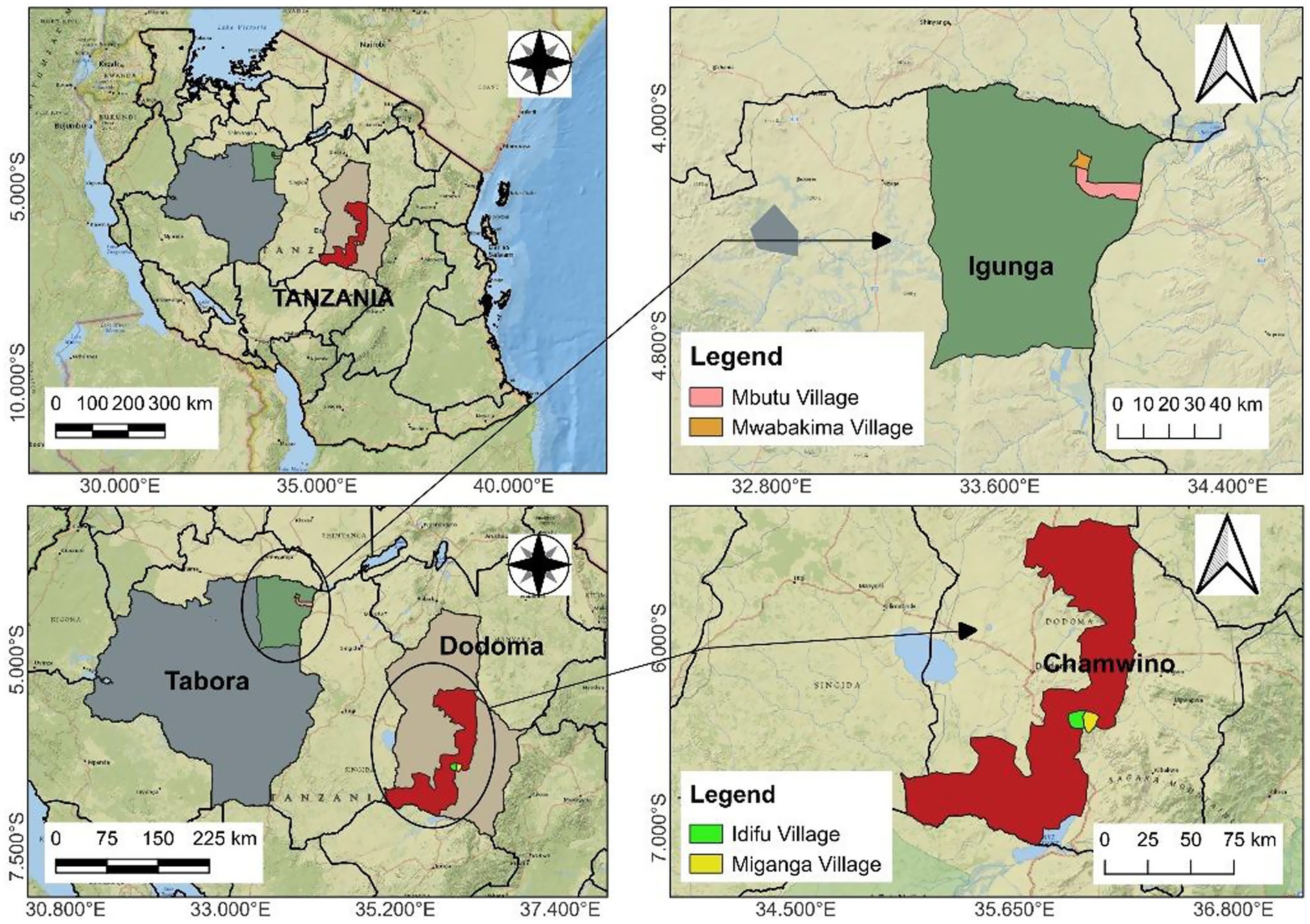 Chamwino and Igunga districts were purposively selected as case studies due to their involvement in eco-village projects between 2015 to 2019. The eco-village projects were ECO-ACT (Eco-Adaptation to Climate Change in Central Tanzania) and IACCA (Integrated Approaches for Climate Change Adaptation). These districts, located in central and western Tanzania represent two agro-ecological zones vulnerable to climate change impacts, such as droughts and erratic rainfall, making them ideal for studying CCA sustainability (Mwandosya et al., 1998). The attached Figure 2 is a Map illustrating study areas positions within Tanzania: Chamwino in Dodoma Region (central plateau) and Igunga in Tabora Region (western plateau). The map highlights study villages which are Idifu and Miganga in Chamwino, and Mbutu and Mwabakima in Igunga. Both districts represent Tanzania’s rain-fed agricultural systems, where over 70% of the population depends on farming, making them ideal for examining post-funding sustainability amid climate variability.
