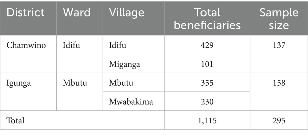 The sample was proportionally distributed across the villages based on their beneficiary populations: 137 respondents from Chamwino District (Idifu: 429 beneficiaries, Miganga: 101 beneficiaries) and 158 respondents from Igunga District (Mbutu: 355 beneficiaries, Mwabakima: 230 beneficiaries), as shown in Table 1. This proportional allocation ensured representative coverage of diverse agro-ecological contexts and implementation experiences, supporting strong analysis of sustainability variations.