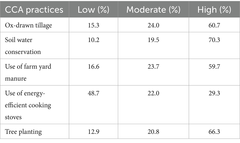 Descriptive analysis was used to quantify the sustainability of CCA practices—tree planting, soil water conservation, farmyard manure use, ox-drawn tillage, and energy-efficient cooking stoves, 5 years post-funding. Implementation extent was categorized as Low (1), Moderate (2), or High (3) based on frequency and percentage distributions. Polychoric Correlation analysis (r) was performed to determine the relationship among CCA practices. Polychoric correlations is suitable for estimating the association between latent continuous variables with ordinal scale nature (1 = Low, 2 = Moderate, 3 = High) underlying the ordinal responses, hence providing a robust measure for non-normal data (Nguyen et al., 2016). To ensure validity and reduce redundancy of the RUS and CSFs constructs, Multiple Correspondence Analysis (MCA) was conducted, resulting to selection of final ten variables after a good score of Cronbach’s Alpha > 0.7. To determine the extent to which one unit change in RUS and CSF constructs influence the change in implementation of CCA practices, the Marginal effects (dy/dx) analyisis was conducted. Marginal effect analysis is proven to be suitable on determining how the dependent variables change in response to changes in the independent attributes (Perraillon et al., 2019).