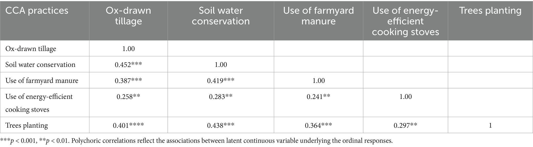 The interdependence among Climate Change Adaptation (CCA) practices in Chamwino and Igunga, agro-ecological zones was analyzed to understand synergistic relationships influencing their sustainability, 5 years after the funding period. Polychoric correlation analysis results in Table 3 revealed significant interdependencies among the five Climate Change Adaptation (CCA). Strongest correlations were observed between soil water conservation and ox-drawn tillage (r = 0.452, p < 0.001) and tree planting (r = 0.438, p < 0.001), indicating robust interdependence among soil management and agroforestry practices. The use of farmyard manure showed significant correlations with soil water conservation (r = 0.419, p < 0.001) and tree planting (r = 0.364, p < 0.001), while energy-efficient cooking stoves exhibited the weakest correlations with other practices ranging between (r = 0.241–0.297, p < 0.01).