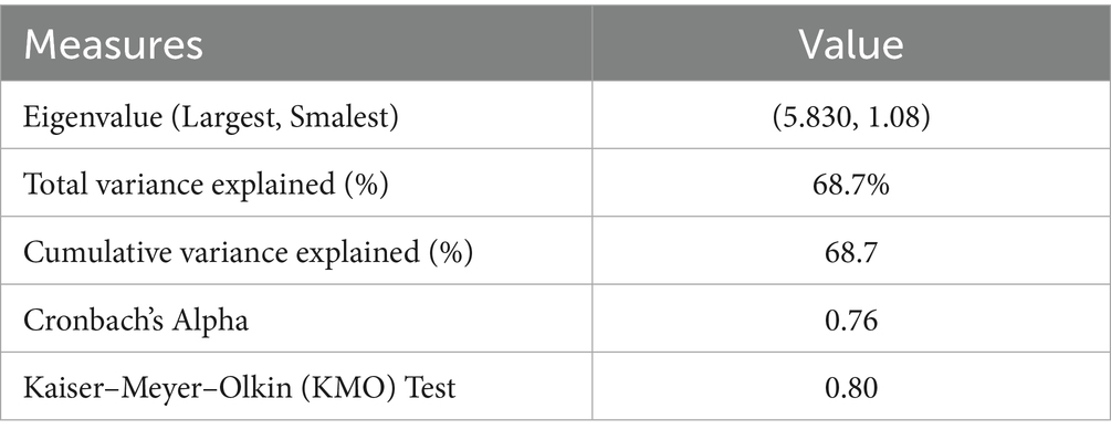 The study utilized Multiple Correspondence Analysis (MCA) to assess the associations and reduce dimensionality among Relative User Satisfaction (RUS) and Critical Success Factors (CSFs) constructs. The MCA results on Table 4 confirmed the suitability of the data, with a Kaiser-Meyer-Olkin (KMO) value of 0.80 indicating adequate sampling and a Cronbach’s alpha of 0.76 demonstrating strong internal consistency across constructs. Two dimensions indicated on Table 5 explained 68.7% of the cumulative variance (eigenvalues: 5.830 and 1.080), effectively capturing the primary RUS and CSF constructs. Key RUS constructs, including self-efficacy (α = 0.79), perceived image (α = 0.77), and usability (α = 0.75), showed strong reliability and significant contributions to Dimension 1 (0.68–0.72) and Dimension 2 (0.46–0.51). This results align with their role in driving sustained adoption of practices like soil water conservation and tree planting. Similarly, CSF constructs such as accountability (α = 0.81), transparency (α = 0.80), and resource provision (α = 0.80) exhibited high reliability and strong associations (Dimension 1: 0.71–0.73, Dimension 2: 0.50–0.54), reflecting their impact on sustainability through governance and community engagement (Agyekum et al., 2024). Constructs like subjective norms (α = 0.69) and individual performance (α = 0.66) showed lower reliability and variance, leading to their exclusion as predictors of CCA practice sustainability post-funding.
