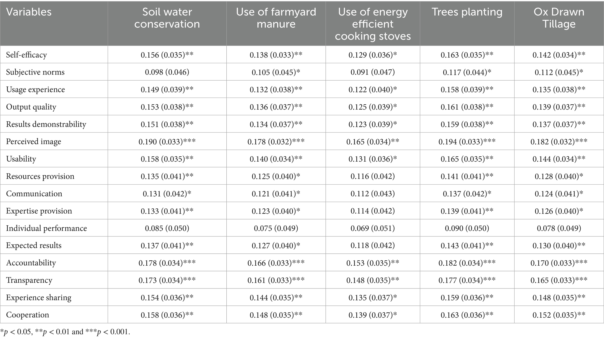 The significant role of self-efficacy and usability underscores the importance of user confidence and ease of implementation. This supports the Technology Acceptance Model (TAM) and findings by Oguntuase et al. (2023) and Intergovernmental Panel on Climate Change (2022), which highlight perceived ease of use as a determinant of sustained technology adoption. Furthermore, the moderate effects of cooperation, experience sharing, and expected results emphasize the role of community networks and peer learning. Berrang-Ford et al. (2011) and Agyekum et al. (2024) similarly found that shared experiences and collective reinforcement enhance the persistence of adaptation practices.