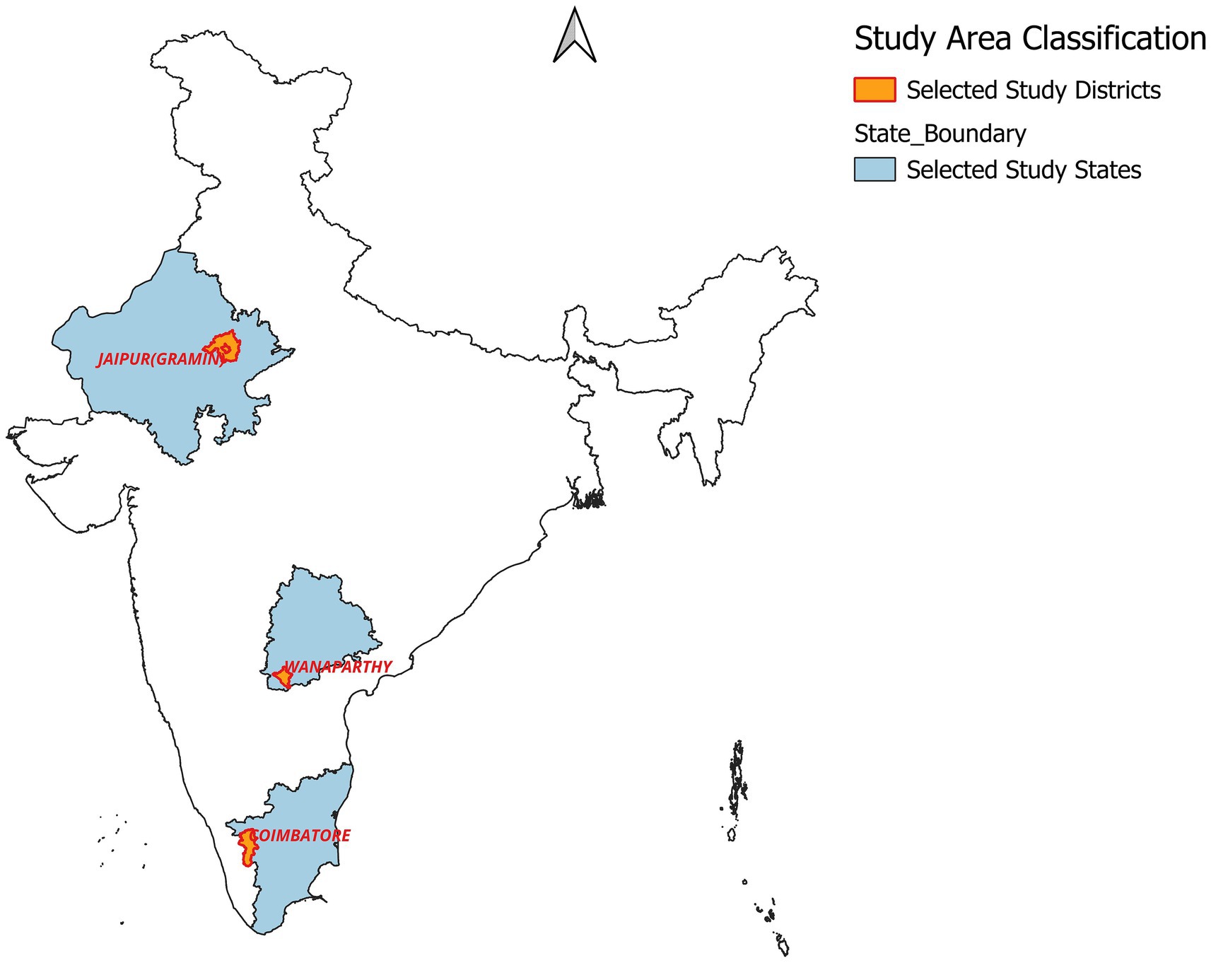The study focused on semi-arid regions constituting approximately 37% of India’s geographic area. A multistage stratified random sampling framework was employed in this study to ensure robust representation of spatial and socio-ecological heterogeneity across three semi-arid states which represent the western, central and southern semi-arid agro-ecological zones of India: Rajasthan, Telangana and Tamil Nadu as shown in Figure 2. These states were selected in particular because of their distinct drought profiles and climate factors such as long-term variations in temperature, precipitation, drought vulnerability etc. (Rao et al., 2013; Dasgupta et al., 2024). District profiles pertaining to these climatic factors were used to select the districts such as Jaipur (Rajasthan) falls under high to very high vulnerability, Wanaparthy (Telangana) as medium vulnerability and Coimbatore (Tamil Nadu) was categorized as low to medium vulnerability. A Modified Menn-Kendall (MMK) test (Mann, 1945; Kendall, 1975; Hamed and Rao, 1998) was also used on long-term rainfall and temperature data of the study area to know the climatic trends. This stratified selection was developed to make sure that the analysis captures the socioeconomic and agroclimatic diversity in resilience outcomes as well as the wide variety of vulnerabilities observed throughout India’s semi-arid regions. Two blocks were selected within each district and then five villages were randomly selected within each block, for a total of ten villages per district. In order to ensure accurate representation of intra-regional diversity in vulnerability and resilience patterns, a minimum of twelve households each village were chosen at random, resulting in an overall sample of approximately 375 households. Determination of total sample size was done by employing Cochran’s finite population formulae of Equations 1, 2 as we know the total household population size of the study area is 15,854.