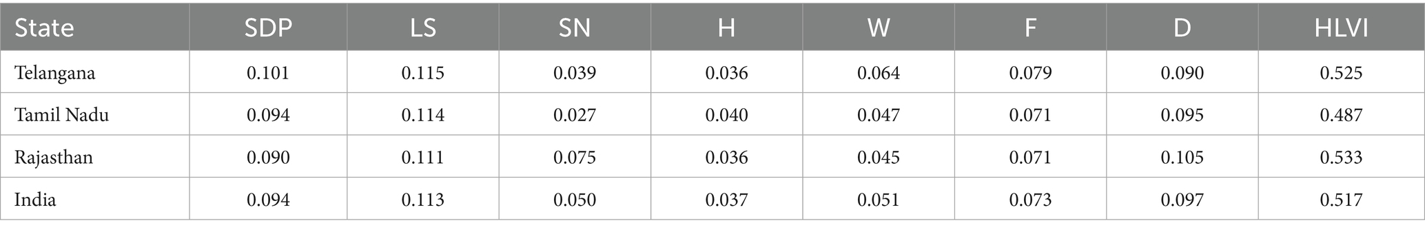 The findings show that in semi-arid India, climate vulnerability was still a structural problem. Telangana and Rajasthan’s high HLVI levels result of their dependency on rainfed agriculture, socioeconomic limitations and long-standing exposure to severe droughts. These findings resonate with earlier studies (Kumar and Mohanasundari, 2025) and various reports discovered that livelihood dependency and climate exposure were the main factors influencing vulnerability in dry areas. Strong contributions to the vulnerability were made by LS, SDP, D, and F. Rural households continue to rely heavily on rainfed agriculture and seasonal wage labor which were particularly unstable and highly susceptible to climate shocks. Despite numerous governmental and non-governmental efforts promoting livelihood diversification, a significant proportion of the rural population remains locked into low-return, insecure forms of employment such as agricultural wage labor. These forms of labor were often characterized by irregularity, low pay and lack of social protection thereby increasing household vulnerability and constraining their capacity to build resilience (De Haan and Zoomers, 2005; Sam et al., 2016). Several studies have affirmed that households engaged primarily in casual labor tend to experience higher exposure to risk and reduced ability to absorb or adapt to stressors, due to limited asset accumulation and constrained agency over livelihood choices (Narayanan and Gerber, 2016; FAO, 2018).