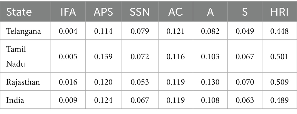 National average HRI score of 0.489 which was shown in Table 5 indicated a moderate level of household resilience across India’s semi-arid regions. Access to public services (APS) had the highest value at 0.124 closely followed by adaptive capacity (AC) at 0.119 and assets (A) at 0.108. The lowest national average score was for income and food access (IFA) 0.009, stability (S) 0.063 and 0.067 for social safety nets (SSN). Rajasthan had the greatest HRI of 0.509 at the state level which was supported by its strongest score in adaptive capacity (0.119), asset ownership (0.130) and stability (0.070). Other component values were IFA (0.016), SSN (0.053) and APS (0.120). Tamil Nadu with an HRI score of 0.501 ranked in second. APS contributed the most to Tamil Nadu’s component values (0.139) the highest of the three states indicating effective delivery of public services performance. Following APS, assets (0.103), AC (0.116), stability (0.067), SSN (0.072) and IFA (0.005) were the contributions to the resilience. Tamil Nadu’s resilience pattern was comparatively consistent due to its often balanced scores in all six components particularly in APS and SSN. Telangana, on the other hand holds the lowest HRI (0.448) which indicated that it was less resilient across many areas of interest. Telangana had the lowest IFA score of all the areas examined at 0.004 which suggests that there is limited access to food and steady income. Among the most significant components to Telangana’s resilience structure were APS (0.114) and AC (0.121); other scores included assets (0.082), stability (0.049) and SSN (0.079). Telangana’s low IFA and moderate assets limited the overall resilience index even if its APS and AC values are similar to the national average.