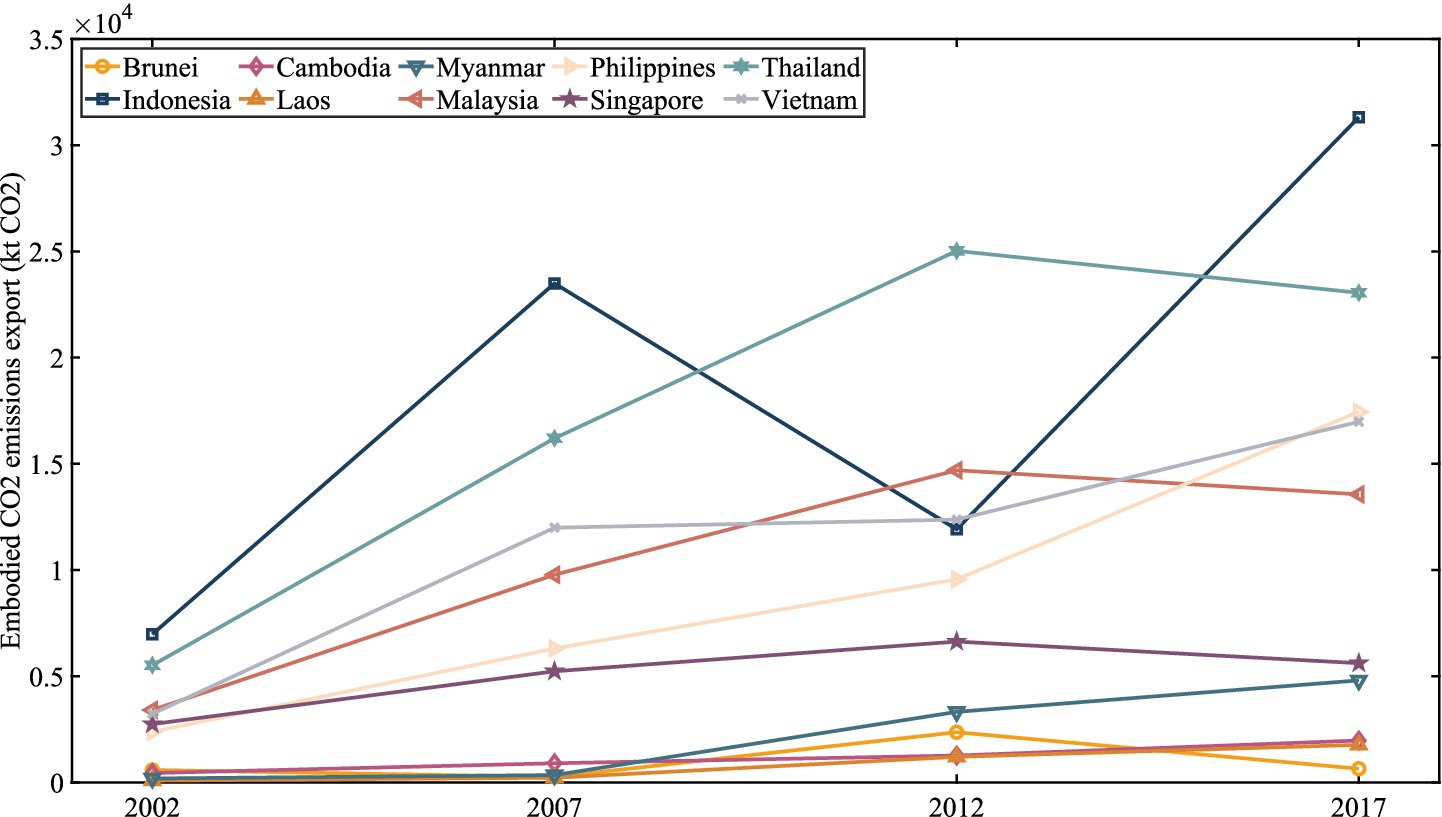 Line graph depicting embodied CO2 emissions exports from 2002 to 2017 for ten Southeast Asian countries. Each country is represented by a different colored line and marker. Emission levels generally rise over the period, with Indonesia showing the most significant increase, peaking in 2017. Other countries, such as Singapore and Thailand, demonstrate moderate increases, while countries like Brunei and Cambodia show lower and more stable levels.