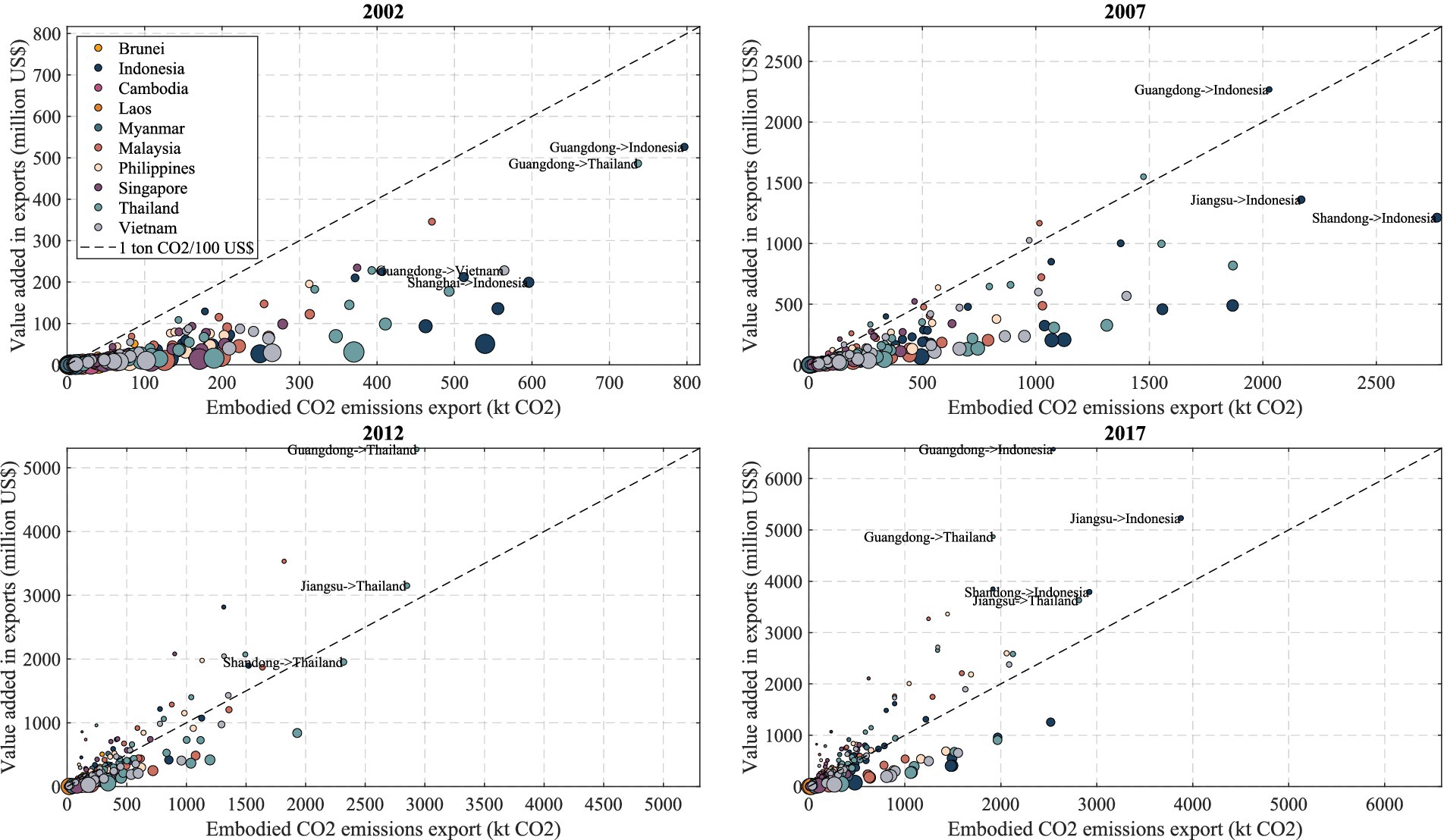 Figure 2. Distribution of embodied CO2 emissions exports and value-added exports from Chinese provinces to ASEAN countries. The size of the circle represents the carbon emissions per unit of exported value added.
