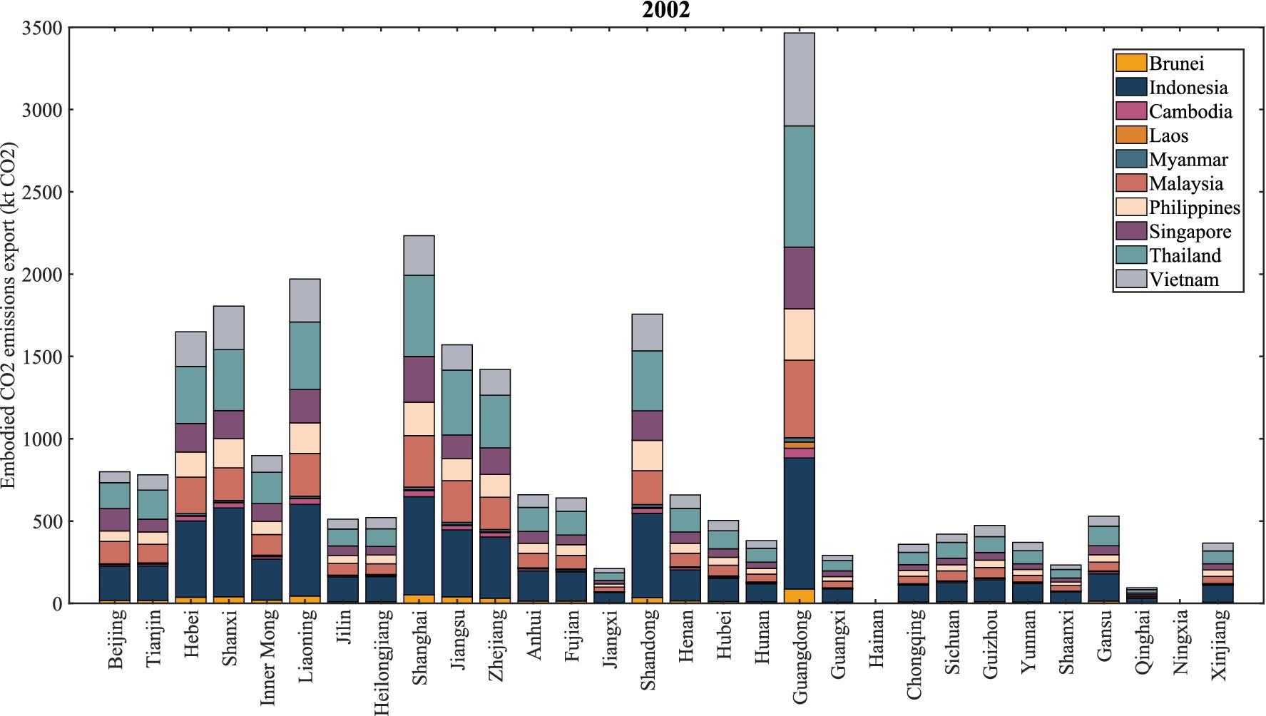 Figure 3. Embodied CO2 emissions exports from Chinese provinces to ASEAN countries in 2002.