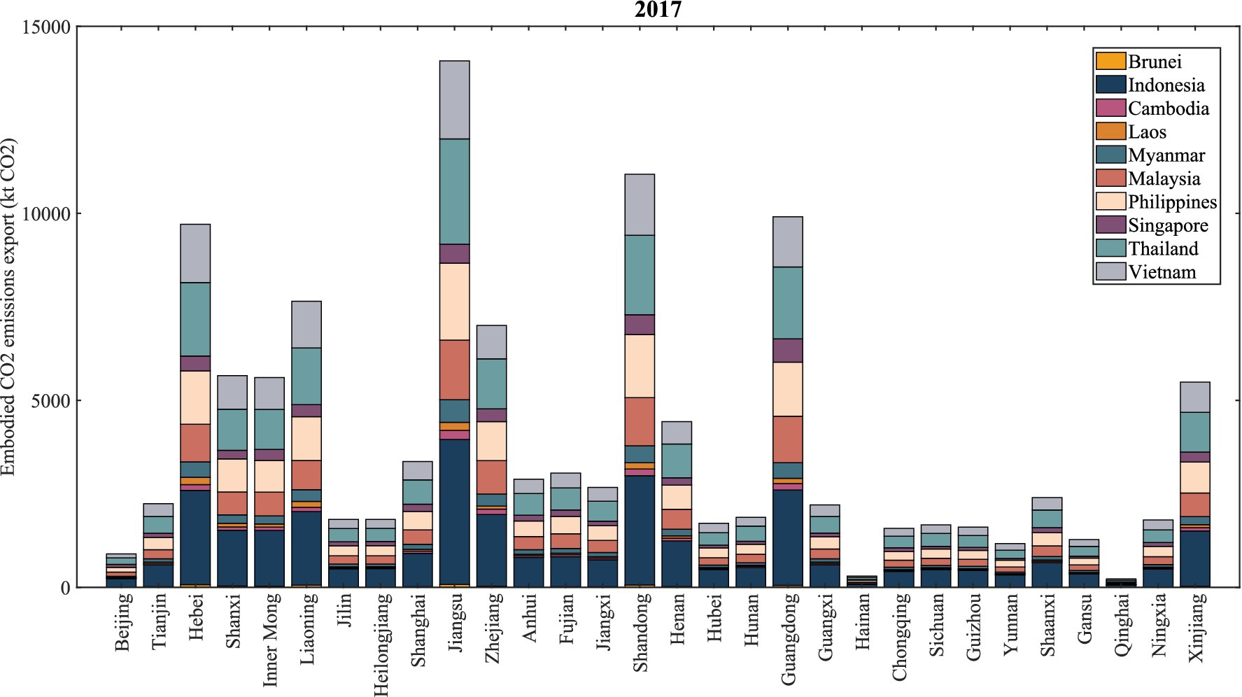 Figure 4. Embodied CO2 emissions exports from Chinese provinces to ASEAN countries in 2017.