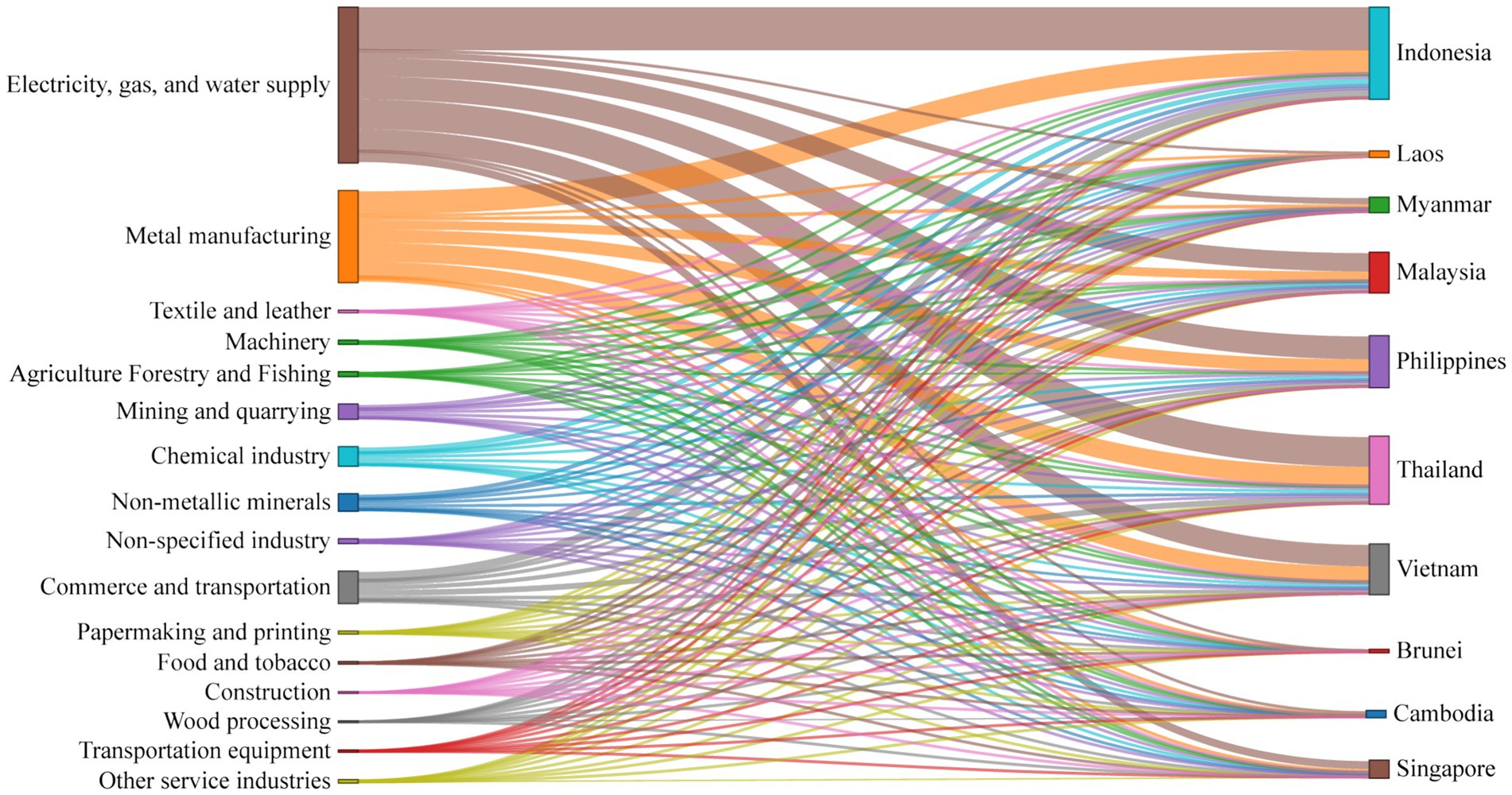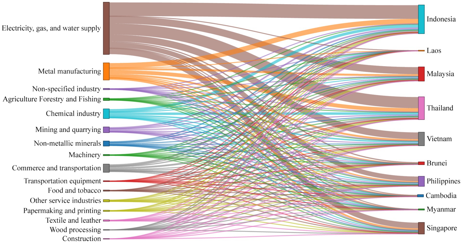 Sankey diagram showing the flow of various industries such as electricity, metal manufacturing, and agriculture to countries like Indonesia, Thailand, and Singapore. Lines represent industry contribution to each country, with color coding for industries and destination countries.