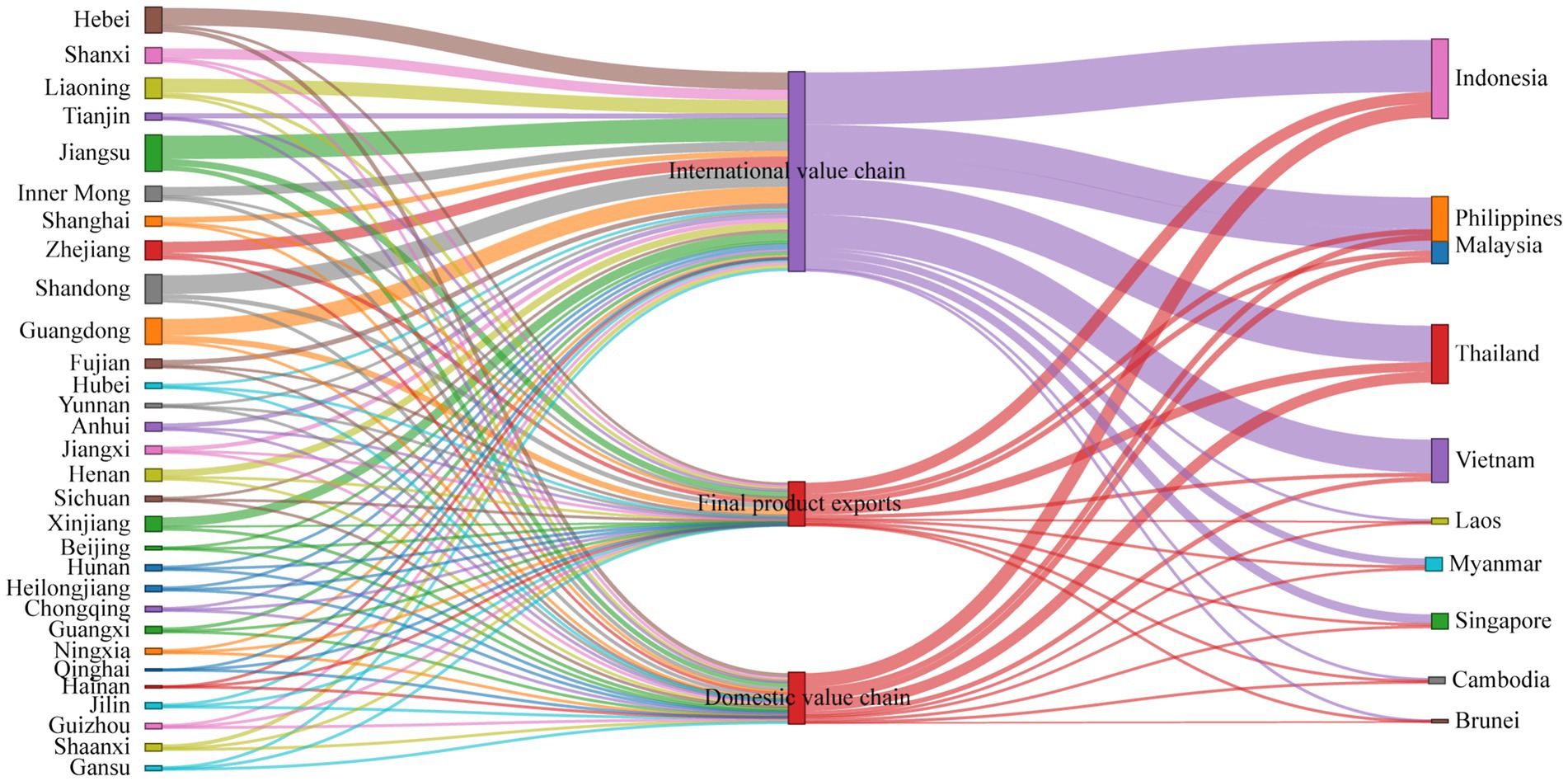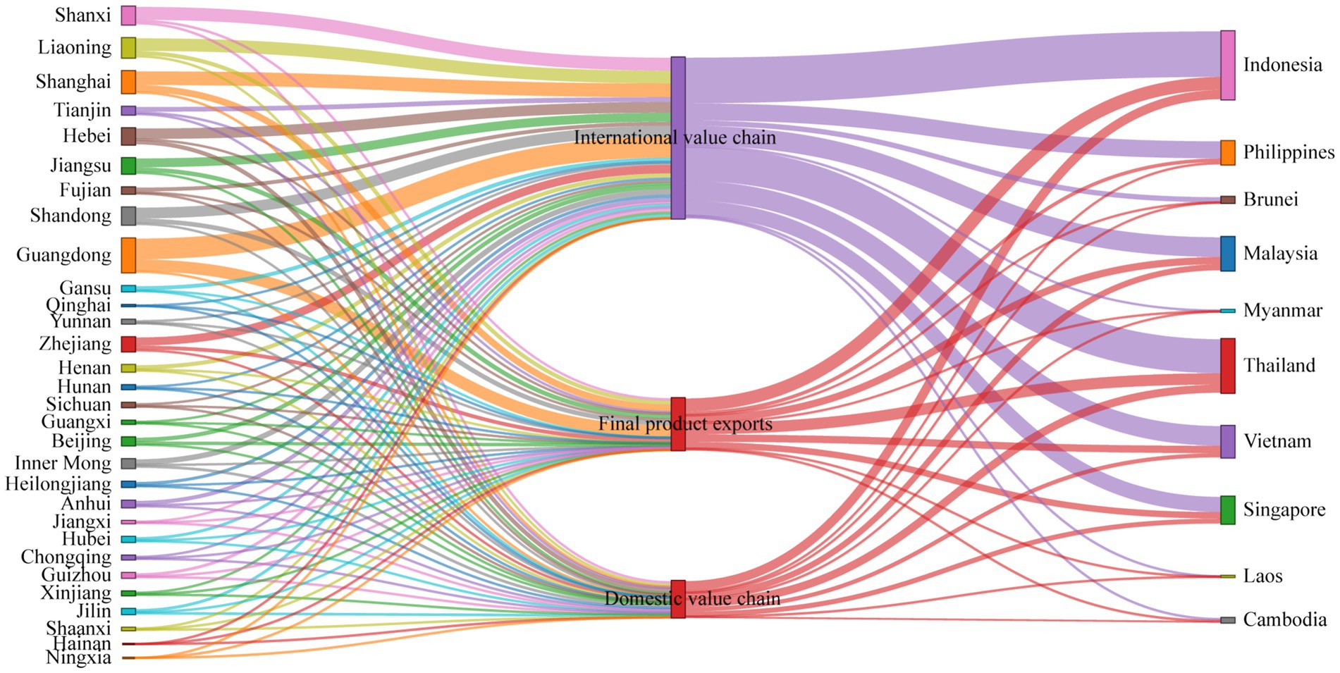 Sankey diagram illustrating trade flows between various Chinese provinces and Southeast Asian countries. The left side lists provinces like Hebei, Jiangsu, and Guangdong, with flows connecting to the right side, showing countries such as Indonesia, Thailand, and Vietnam. Flows indicate movement through the international, final product, and domestic value chains, represented with colorful lines denoting different trade routes.