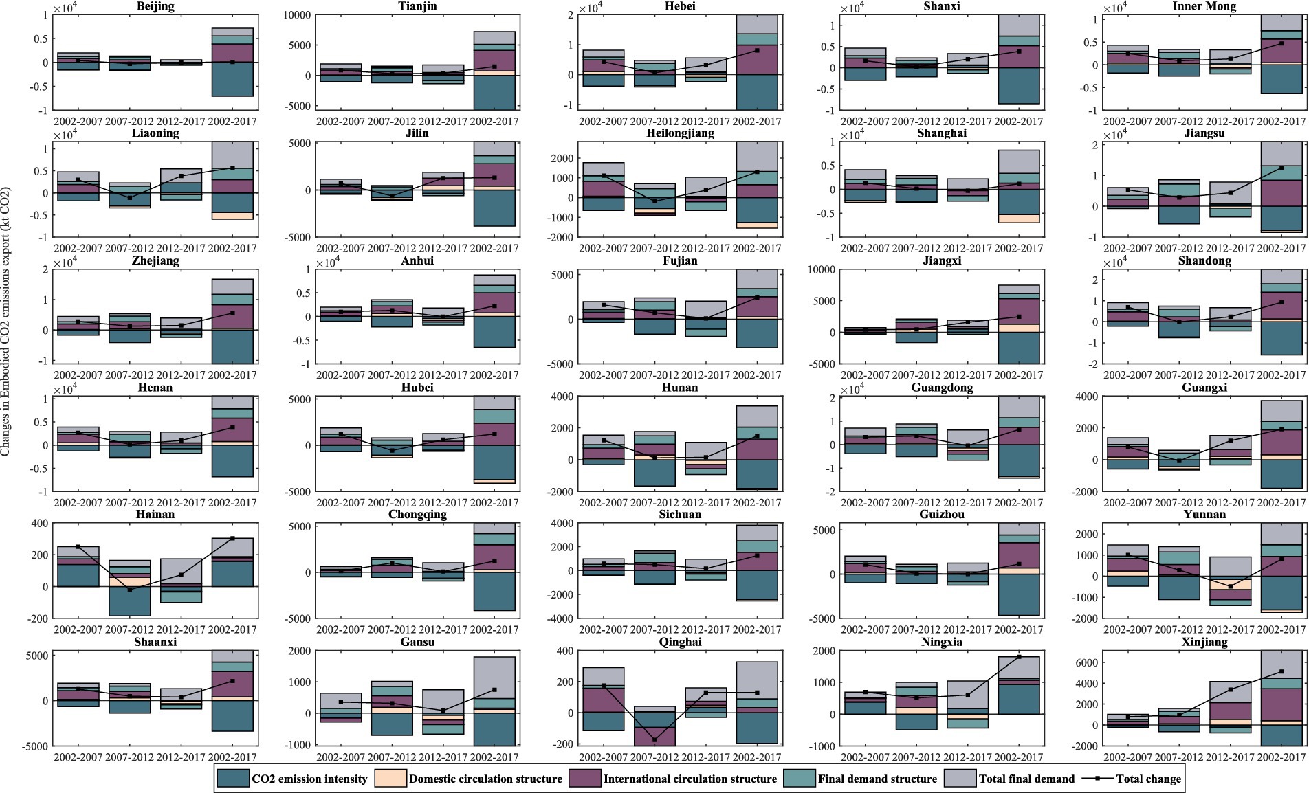 Figure 9. Driving factors for changes in CO2 emissions exports from Chinese provinces to ASEAN.