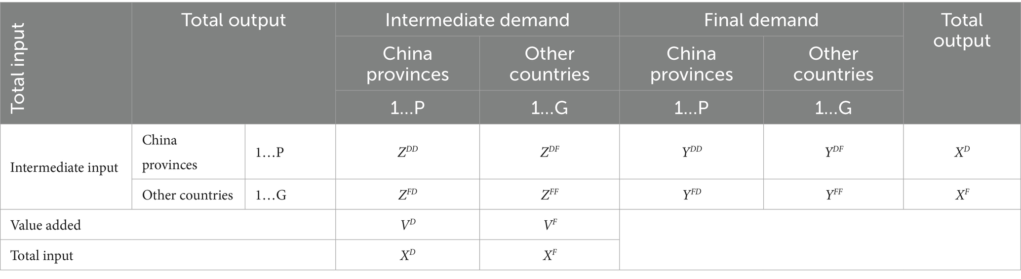 The Multi-Regional Input–Output (MRIO) model enables the tracking and quantification of environmental impacts associated with interregional economic activities, making it a widely adopted framework for calculating embodied CO2 emissions in trade (Meng et al., 2013). In this study, we construct a MRIO table comprising G countries and P Chinese provinces, each with n industrial sectors. The structure of the table is shown in Table 1.