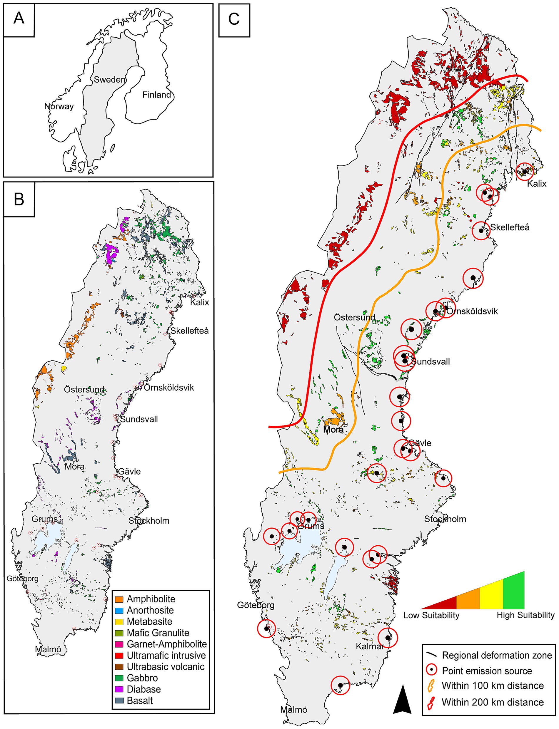 Figure 1. Overview maps of Sweden illustrating key parameters used in site selection for geological assessments. (a) Sweden delineated on an overview map of the Nordic countries. (b) Distribution of different mafic rock types across Sweden based on data from SGU (Geological Survey of Sweden) (2013). (c) Suitability map of mafic rock formations, assessed using geological and geochemical criteria (from previous studies and mapping), and further refined with data from fieldwork and analysis. Areas outside the 200 km buffer zone are shown in red to indicate exclusion based on distance from emission sources, rather than geological unsuitability.